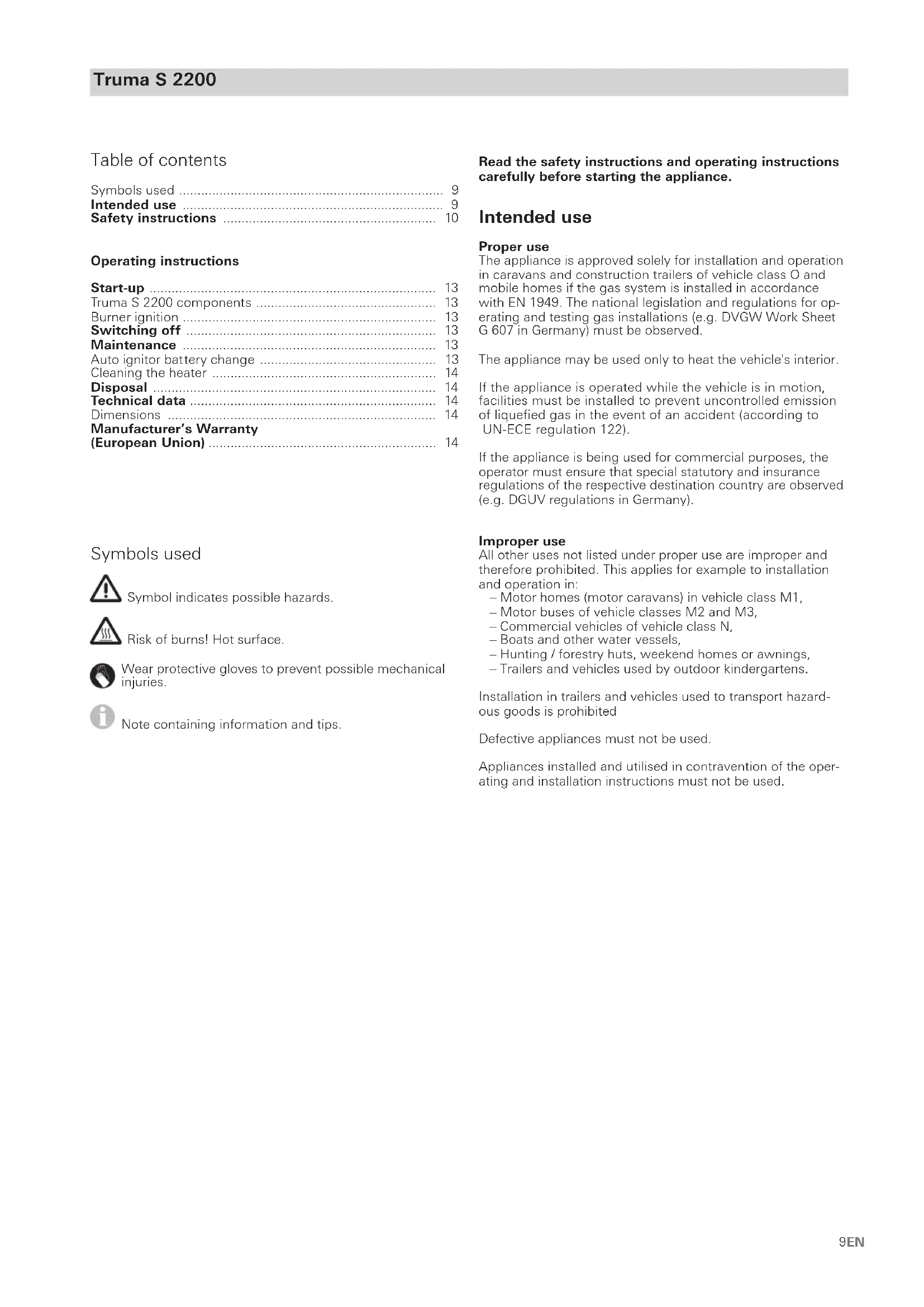 - Die Garantie ist bei einem autorisierten Servicepartner oder beim Truma Servicezentrum geltend zu machen. Alle Adres- sen und Telefonnummern finden Sie unter www.truma.com im Bereich „Service“. Die Anschrift des Herstellers lautet: Truma Gerätetechnik GmbH & Co. KG Truma Servicezentrum Wernher-von- Braun-Straße 12 85640 Putzbrunn, Deutschland Um einen reibungslosen Ablauf zu gewährleisten, bitten wir bei Kontaktaufnahme die folgenden Informationen bereit zu halten: – detaillierte Mangelbeschreibung – Seriennummer des Gerätes – Kaufdatum Der autorisierte Servicepartner oder das Truma Servicezent- rum legen jeweils die weitere Vorgehensweise fest. Um even- tuelle Transportschäden zu vermeiden, darf das betroffene Gerät nur nach vorheriger Rücksprache mit dem autorisierten Servicepartner oder dem Truma Servicezentrum versendet werden. Wenn der Garantiefall vom Hersteller anerkannt wird, über- nimmt der Hersteller die Transportkosten. Liegt kein Garan- tiefall vor, wird der Verbraucher entsprechend informiert und die Reparatur- und Transportkosten gehen zu seinen Lasten. Von Einsendungen ohne vorherige Rücksprache bitten wir abzusehen.9EN Truma S 2200 Read the safety instructions and operating instructions carefully before starting the appliance. Intended use Proper use The appliance is approved solely for installation and operation in caravans and construction trailers of vehicle class O and mobile homes if the gas system is installed in accordance with EN 1949. The national legislation and regulations for op- erating and testing gas installations (e.g. DVGW Work Sheet G 607 in Germany) must be observed. The appliance may be used only to heat the vehicle's interior. If the appliance is operated while the vehicle is in motion, facilities must be installed to prevent uncontrolled emission of liquefied gas in the event of an accident (according to UN-ECE regulation 122). If the appliance is being used for commercial purposes, the operator must ensure that special statutory and insurance regulations of the respective destination country are observed (e.g. DGUV regulations in Germany). Improper use All other uses not listed under proper use are improper and therefore prohibited. This applies for example to installation and operation in: – Motor homes (motor caravans) in vehicle class M1, – Motor buses of vehicle classes M2 and M3, – Commercial vehicles of vehicle class N, – Boats and other water vessels, – Hunting / forestry huts, weekend homes or awnings, – Trailers and vehicles used by outdoor kindergartens. Installation in trailers and vehicles used to transport hazard- ous goods is prohibited Defective appliances must not be used. Appliances installed and utilised in contravention of the oper- ating and installation instructions must not be used. Symbols used Symbol indicates possible hazards. Risk of burns! Hot surface. Wear protective gloves to prevent possible mechanical injuries. Note containing information and tips. Table of contents Symbols used p. 9