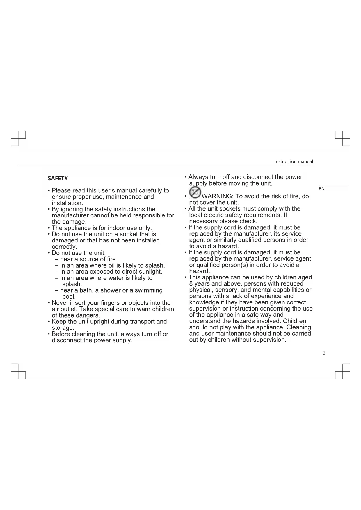 - This appliance can be used by children aged 8 years and above, persons with reduced physical, sensory, and mental capabilities or persons with a lack of experience and knowledge if they have been given correct supervision or instruction concerning the use of the appliance in a safe way and understand the hazards involved. Children should not play with the appliance. Cleaning and user maintenance should not be carried out by children without supervision. ENInstruction manual