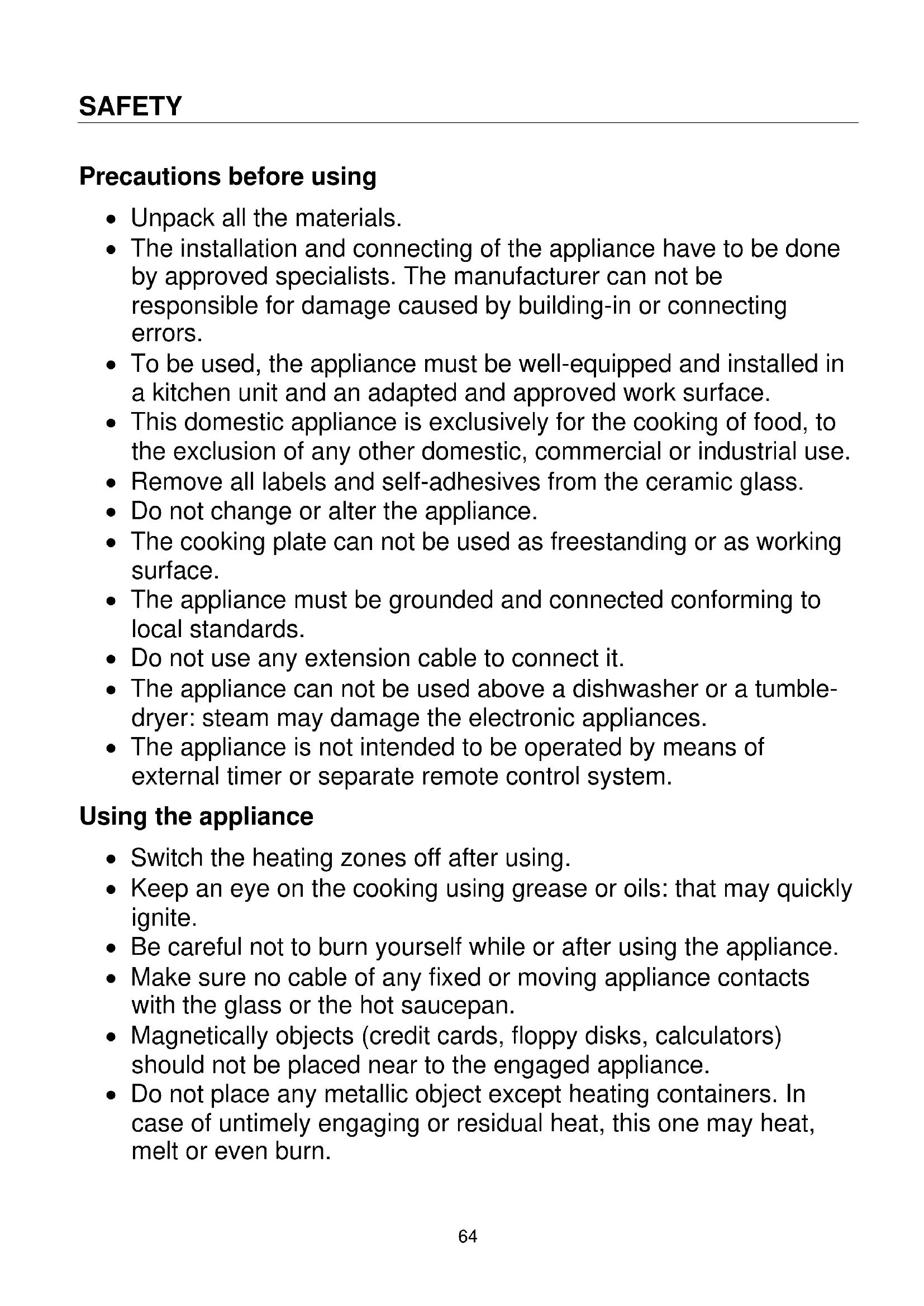 - Sugar, synthetic materials or aluminium sheets must not contact with the heating zones. These may cause breaks or other alterations of the vitroceramic glass by cooling: switch on the appliance and take them immediately out of the hot heating zone (be careful: do not burn yourself).