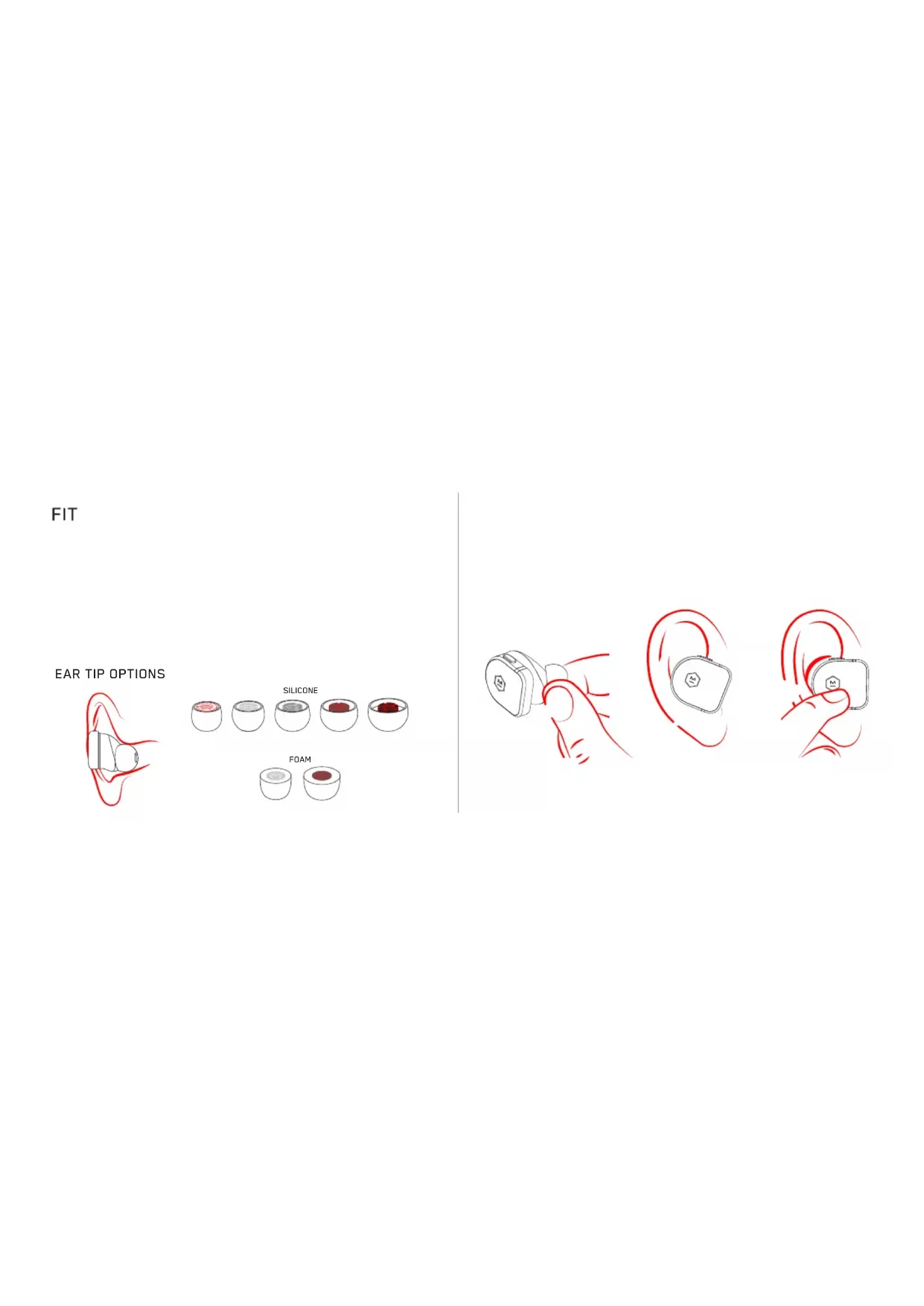 (OR ACCEPT CALL FROM YOUR DEVICE) PRESS: MULTI-FUNCTION BUTTON HOLD VOL + FOR “AMBIENT LISTENING” MODE ON/OFF (SEE PAGE 6 FOR MORE INFORMATION ON AMBIENT LISTENING) VOL + HOLD VOL - FOR “ACTIVE NOISE-CANCELLING” ON/OFF (SEE PAGE 6 FOR MORE INFORMATION ON ANC) VOL - MULTI-FUNCTION BUTTON VOL +VOL - PROXIMITY SENSORS3 Your earphones come with the medium silicone ear tips attached. Choose the silicone or foam ear tips that form a seal with your ear canal. Silicone ear tips are durable and easy to clean, while foam ear tips offer a more secure fit and superior sound isolation. Our custom round ear tips are designed in conjunction with the oval nozzle shape to provide a superior universal fit. Squeeze the ear tip to match its orientation to the nozzle and then press the ear tip against the nozzle to attach. To insert your earphones using foam ear tips, gently compress the foam ear tip using your fingers and insert it into your ear. Hold the earphones in place until the foam fully expands and forms a seal with your ear canal.