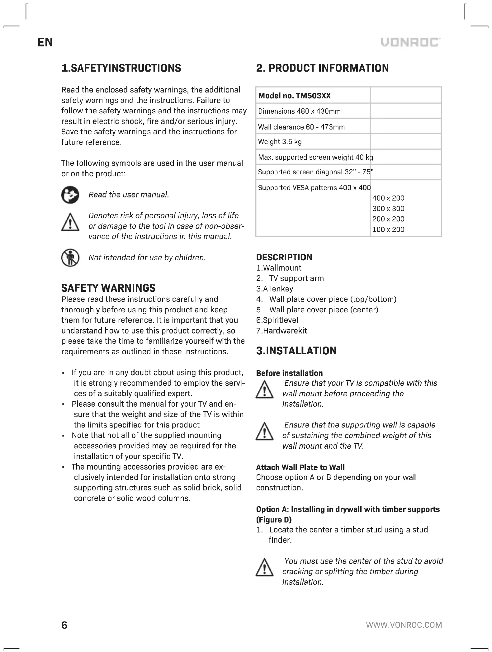TM503XX - TV Stand Vonroc - Free user manual and instructions