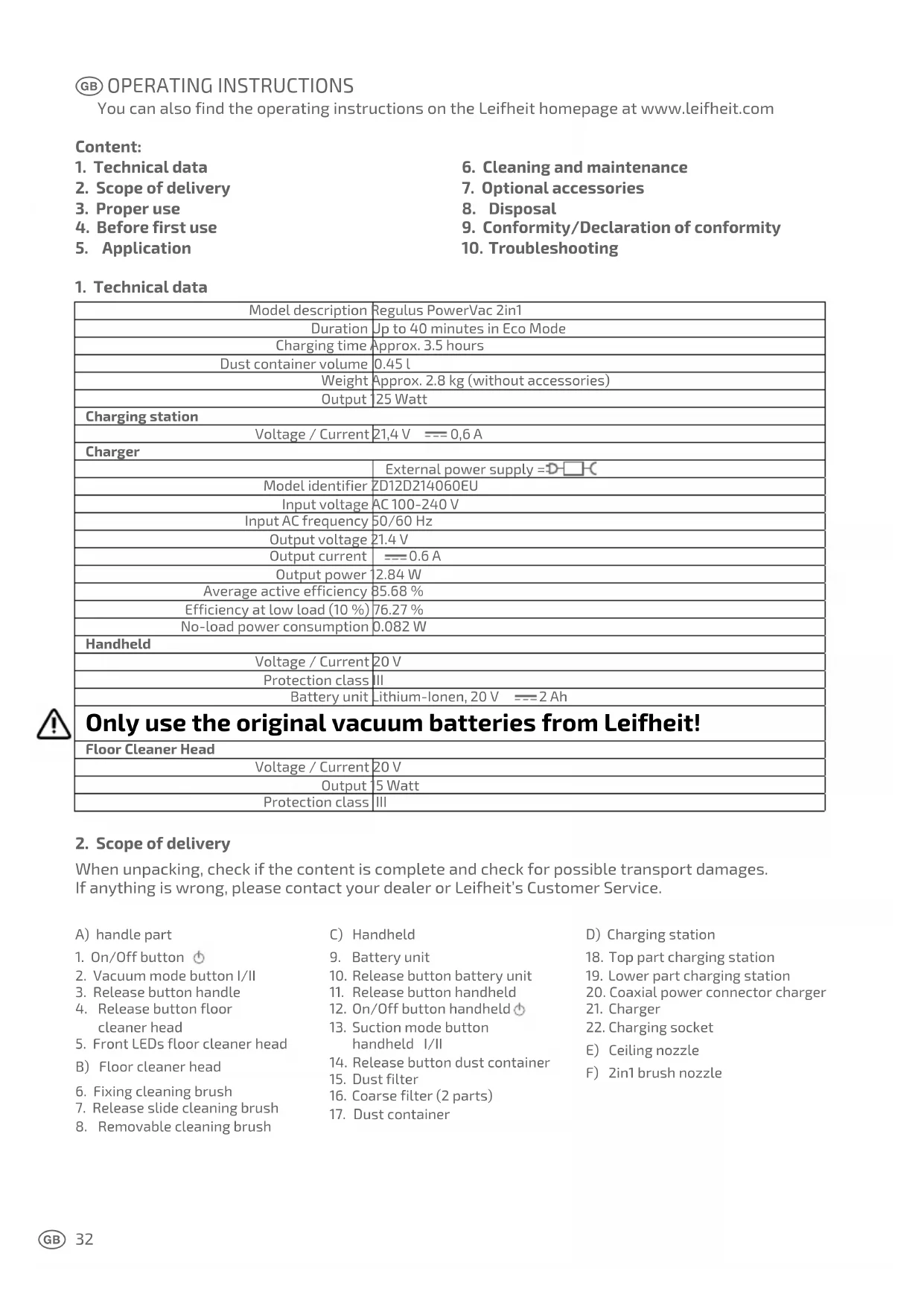 Dear customer, Congratulations on your new cordless vacuum cleaner Regulus PowerVac 2in1! We believe you have made an excellent choice in this purchase and have acquired a high quality product from Leifheit. Please read the operating instructions before using the Regulus PowerVac 2in1 and keep them in a safe place for later use or for subsequent owners. They will help you to use the device sensibly and correctly and to avoid misuse from the start. Pay particular attention to the safety instructions provided in this manual. We hope that you are more than satisfied with the cordless vacuum cleaner. Simply call us should you have any questions or suggestions about our product. The Leifheit team will be happy to help you. International PH.: +49 26 04 97 70 Monday to Friday 8.00 to 18.00 CET If you would like to write to us, there is a contact form available on the Leifheit homepage www.leifheit.de or you can use the post service. Regards, Your Leifheit Team