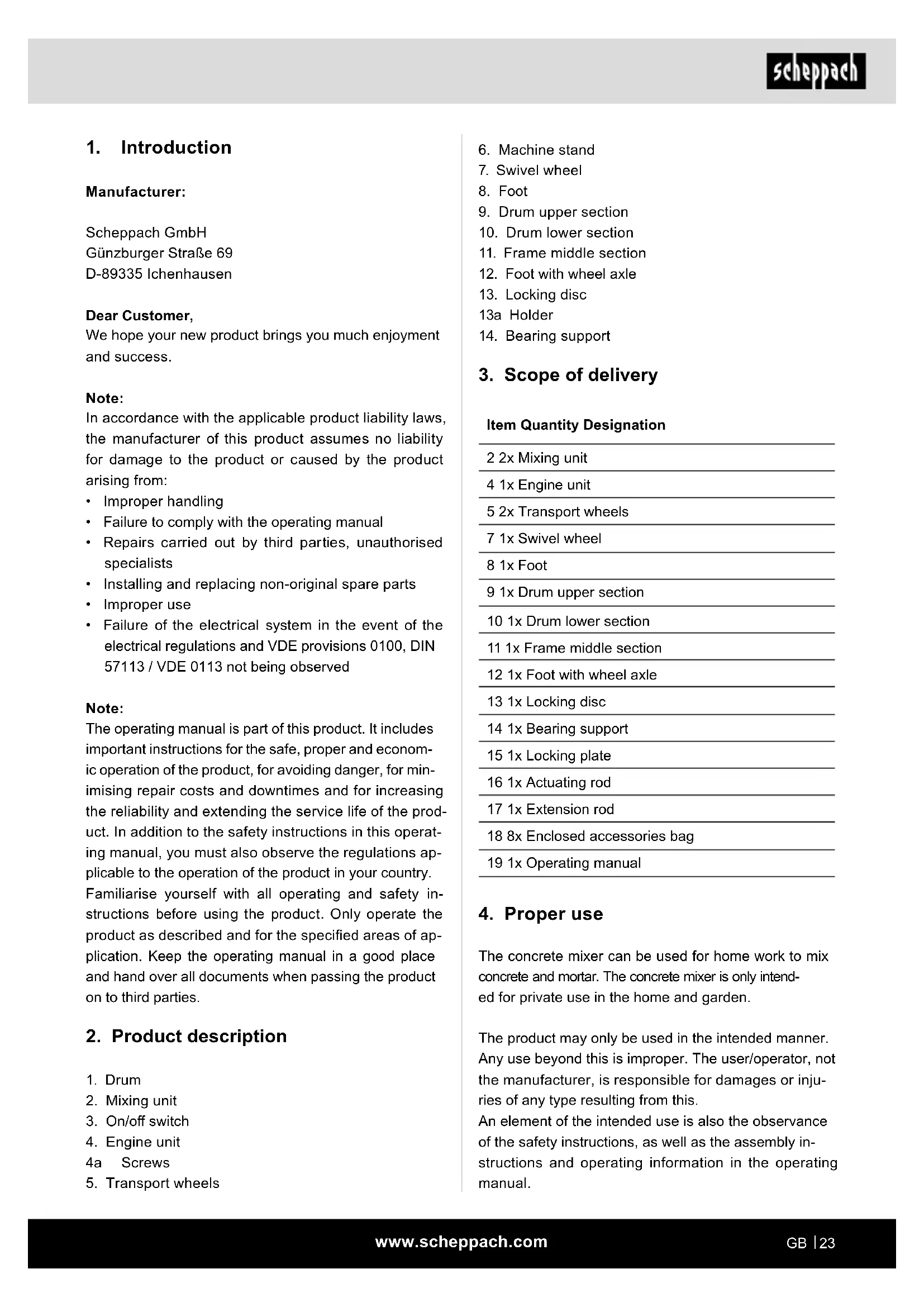 The concrete mixer can be used for home work to mix concrete and mortar. The concrete mixer is only intend- ed for private use in the home and garden. The product may only be used in the intended manner. Any use beyond this is improper. The user/operator, not the manufacturer, is responsible for damages or inju- ries of any type resulting from this. An element of the intended use is also the observance of the safety instructions, as well as the assembly in- structions and operating information in the operating manual.