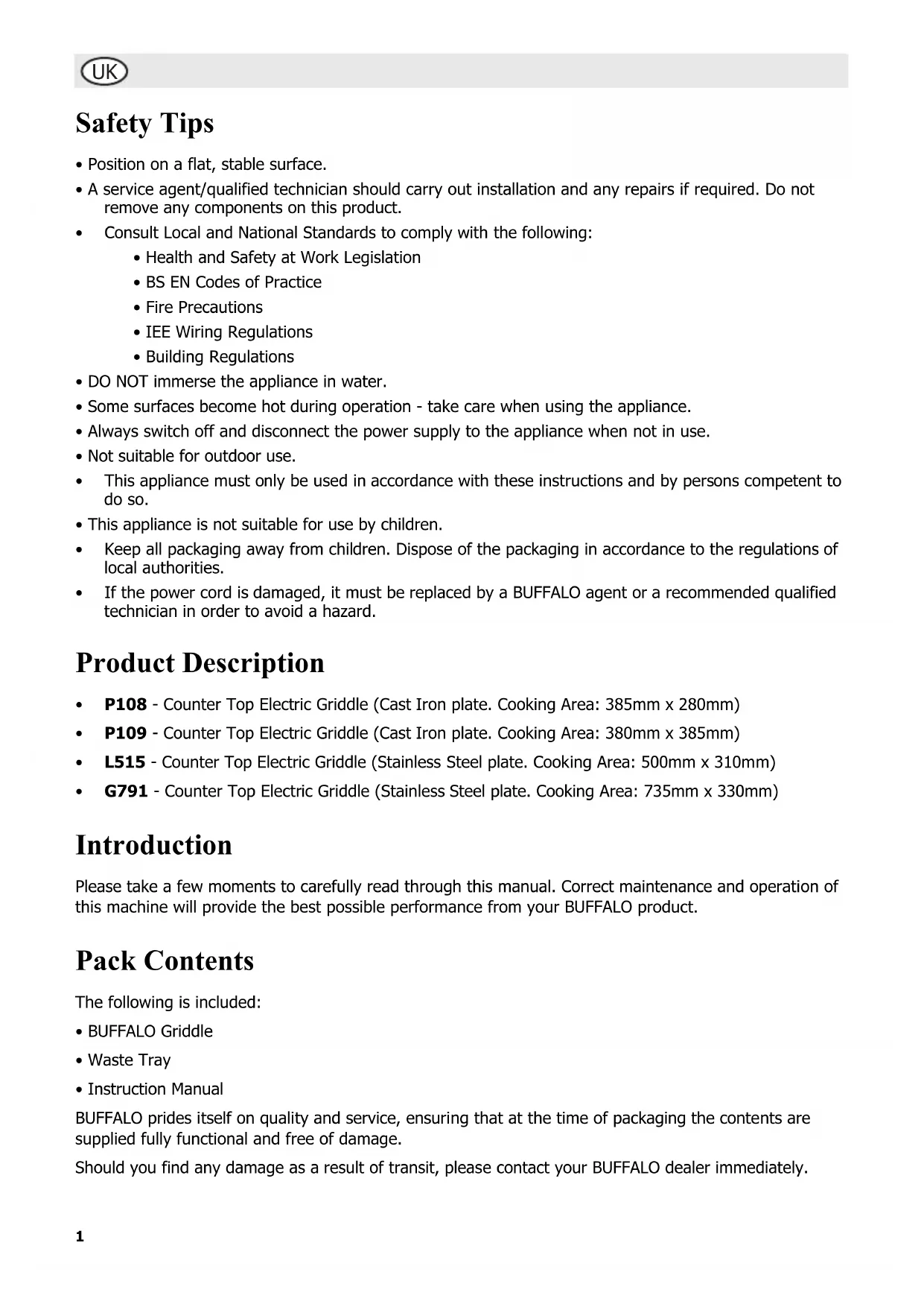 - G791 - Counter Top Electric Griddle (Stainless Steel plate. Cooking Area: 735mm x 330mm) Introduction Please take a few moments to carefully read through this manual. Correct maintenance and operation of this machine will provide the best possible performance from your BUFFALO product. Pack Contents The following is included: