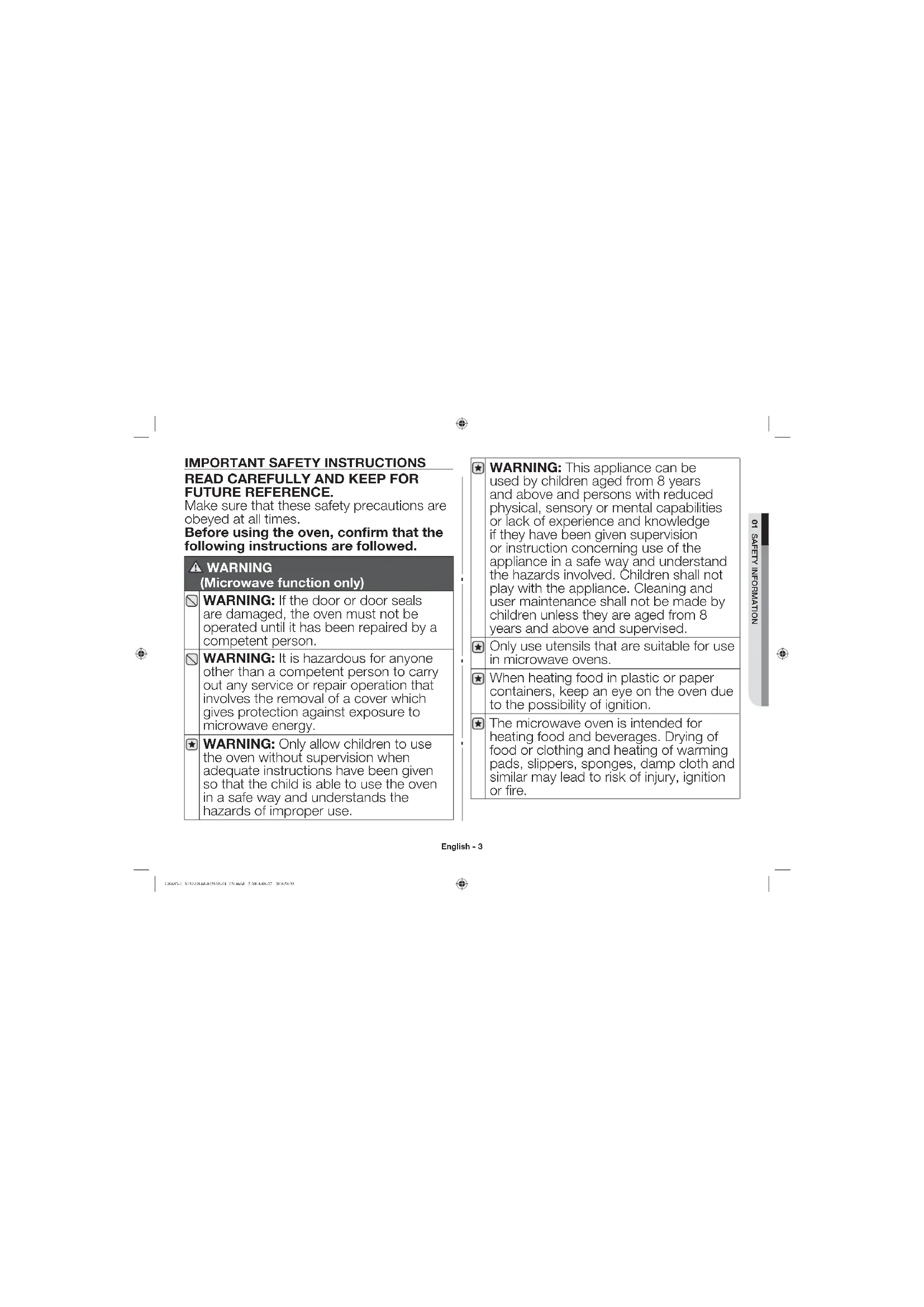 used by children aged from 8 years and above and persons with reduced physical, sensory or mental capabilities or lack of experience and knowledge if they have been given supervision or instruction concerning use of the appliance in a safe way and understand the hazards involved. Children shall not play with the appliance. Cleaning and user maintenance shall not be made by children unless they are aged from 8 years and above and supervised. Only use utensils that are suitable for use in microwave ovens. When heating food in plastic or paper containers, keep an eye on the oven due to the possibility of ignition. The microwave oven is intended for heating food and beverages. Drying of food or clothing and heating of warming pads, slippers, sponges, damp cloth and similar may lead to risk of injury, ignition or fire. GK643-E_XEU-DE68-04281B-01_EN.indd 3 2014-06-27 6:54:28English - 4 This appliance is not intended for use by persons (including children) with reduced physical, sensory or mental capabilities, or lack of experience and knowledge, unless they have been given supervision or instruction concerning use of the appliance by a person responsible for their safety. Children should be supervised to ensure that they do not play with the appliance. If the supply cord is damaged, it must be replaced by the manufacturer, its service agent or similarly qualified persons in order to avoid a hazard.