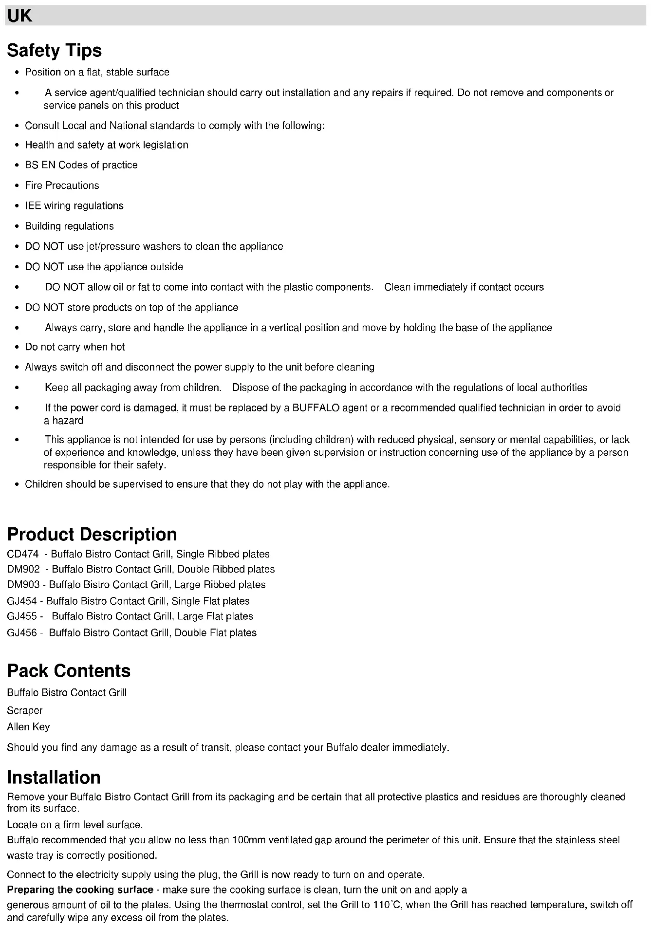 - Children should be supervised to ensure that they do not play with the appliance. Product Description CD474 - Buffalo Bistro Contact Grill, Single Ribbed plates DM902 - Buffalo Bistro Contact Grill, Double Ribbed plates DM903 - Buffalo Bistro Contact Grill, Large Ribbed plates GJ454 - Buffalo Bistro Contact Grill, Single Flat plates GJ455 - Buffalo Bistro Contact Grill, Large Flat plates GJ456 - Buffalo Bistro Contact Grill, Double Flat plates Pack Contents Buffalo Bistro Contact Grill Scraper Allen Key Should you find any damage as a result of transit, please contact your Buffalo dealer immediately. Installation Remove your Buffalo Bistro Contact Grill from its packaging and be certain that all protective plastics and residues are thoroughly cleaned from its surface. Locate on a firm level surface. Buffalo recommended that you allow no less than 100mm ventilated gap around the perimeter of this unit. Ensure that the stainless steel waste tray is correctly positioned. Connect to the electricity supply using the plug, the Grill is now ready to turn on and operate. Preparing the cooking surface - make sure the cooking surface is clean, turn the unit on and apply a generous amount of oil to the plates. Using the thermostat control, set the Grill to 110˚C, when the Grill has reached temperature, switch off and carefully wipe any excess oil from the plates.Telephone Helpline: 0845 146 2887 UK Operation The Contact Grill should be turned on at least 5 minutes before use To get efficient use out of this unit while in intermittent use, it is recommended that the Grill plates remain closed and the thermostat turned down, when not cooking. This will assist in reducing power consumption and also allow for quicker heat response when needed. Buffalo recommends that the cooking surface is lightly greased, before each use. A temperature setting of between 200°Cand 220°C will be sufficient for general cooking. This may vary for particular food types, individual needs, or experience. Simply place the food products on the bottom grilling surface and lower the top plate down, and cook to your needs.