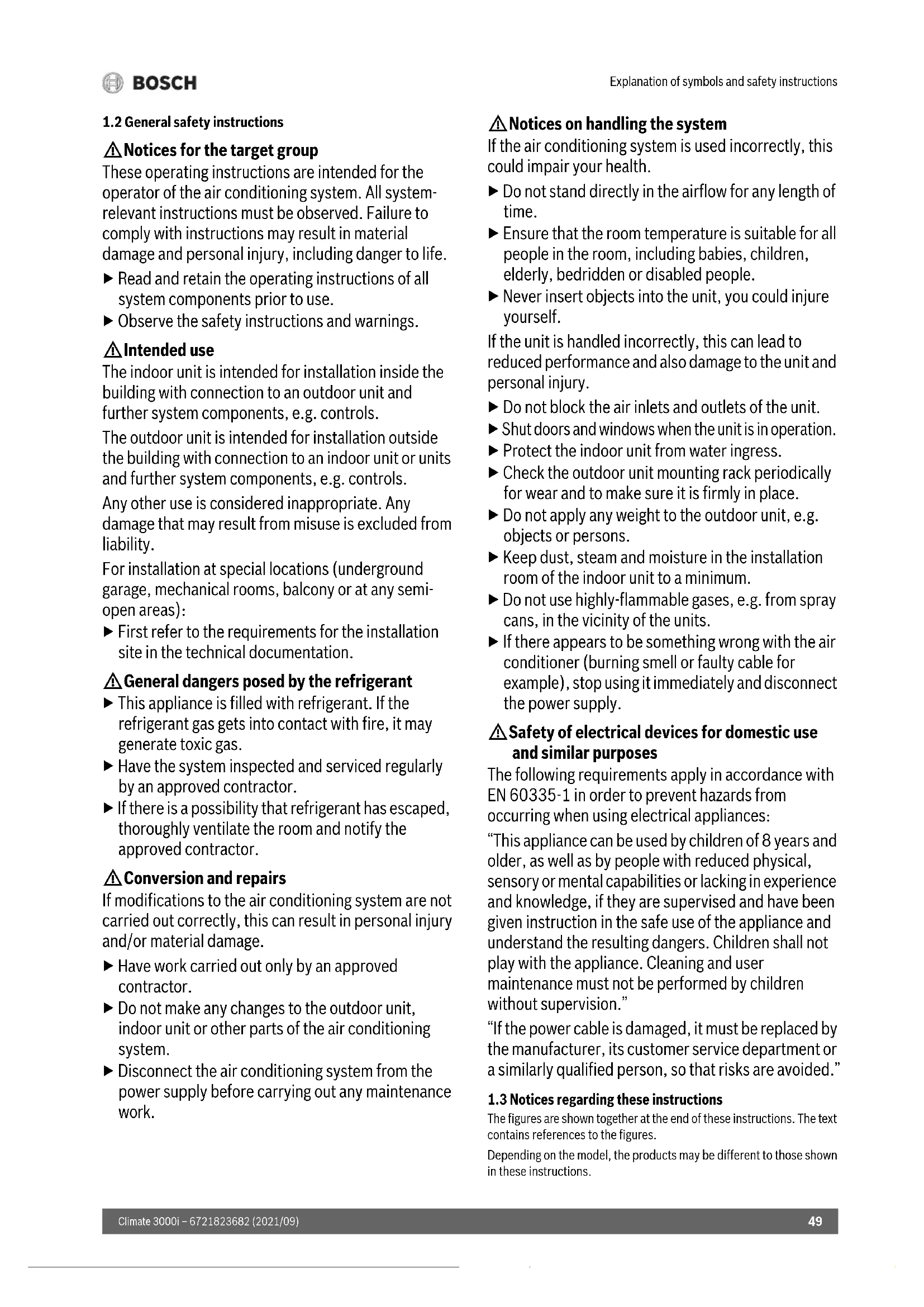 H Notices for the target group These operating instructions are intended for the operator of the air conditioning system. All system- relevant instructions must be observed. Failure to comply with instructions may result in material damage and personal injury, including danger to life. ▶ Read and retain the operating instructions of all system components prior to use. ▶ Observe the safety instructions and warnings. H Intended use The indoor unit is intended for installation inside the building with connection to an outdoor unit and further system components, e.g. controls. The outdoor unit is intended for installation outside the building with connection to an indoor unit or units and further system components, e.g. controls. Any other use is considered inappropriate. Any damage that may result from misuse is excluded from liability. For installation at special locations (underground garage, mechanical rooms, balcony or at any semi- open areas): ▶ First refer to the requirements for the installation site in the technical documentation. H General dangers posed by the refrigerant ▶ This appliance is filled with refrigerant. If the refrigerant gas gets into contact with fire, it may generate toxic gas. ▶ Have the system inspected and serviced regularly by an approved contractor. ▶ If there is a possibility that refrigerant has escaped, thoroughly ventilate the room and notify the approved contractor. H Conversion and repairs If modifications to the air conditioning system are not carried out correctly, this can result in personal injury and/or material damage. ▶ Have work carried out only by an approved contractor. ▶ Do not make any changes to the outdoor unit, indoor unit or other parts of the air conditioning system. ▶ Disconnect the air conditioning system from the power supply before carrying out any maintenance work. H Notices on handling the system If the air conditioning system is used incorrectly, this could impair your health. ▶ Do not stand directly in the airflow for any length of time. ▶ Ensure that the room temperature is suitable for all people in the room, including babies, children, elderly, bedridden or disabled people. ▶ Never insert objects into the unit, you could injure yourself. If the unit is handled incorrectly, this can lead to reduced performance and also damage to the unit and personal injury. ▶ Do not block the air inlets and outlets of the unit. ▶ Shut doors and windows when the unit is in operation. ▶ Protect the indoor unit from water ingress. ▶ Check the outdoor unit mounting rack periodically for wear and to make sure it is firmly in place. ▶ Do not apply any weight to the outdoor unit, e.g. objects or persons. ▶ Keep dust, steam and moisture in the installation room of the indoor unit to a minimum. ▶ Do not use highly-flammable gases, e.g. from spray cans, in the vicinity of the units. ▶ If there appears to be something wrong with the air conditioner (burning smell or faulty cable for example), stop using it immediately and disconnect the power supply. H Safety of electrical devices for domestic use and similar purposes The following requirements apply in accordance with EN 60335-1 in order to prevent hazards from occurring when using electrical appliances: “This appliance can be used by children of 8 years and older, as well as by people with reduced physical, sensory or mental capabilities or lacking in experience and knowledge, if they are supervised and have been given instruction in the safe use of the appliance and understand the resulting dangers. Children shall not play with the appliance. Cleaning and user maintenance must not be performed by children without supervision.” “If the power cable is damaged, it must be replaced by the manufacturer, its customer service department or a similarly qualified person, so that risks are avoided.”