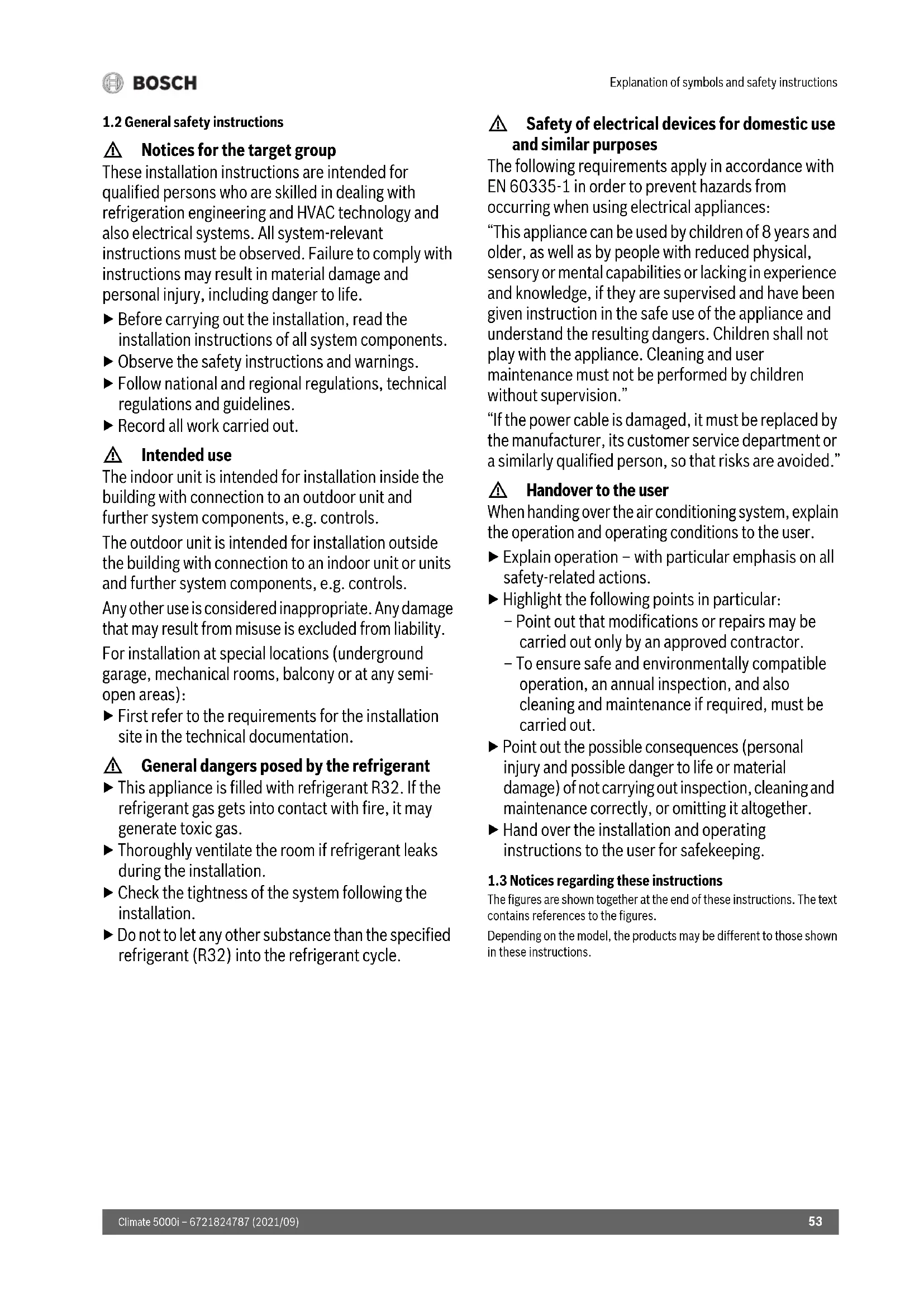 H Notices for the target group These installation instructions are intended for qualified persons who are skilled in dealing with refrigeration engineering and HVAC technology and also electrical systems. All system-relevant instructions must be observed. Failure to comply with instructions may result in material damage and personal injury, including danger to life. ▶ Before carrying out the installation, read the installation instructions of all system components. ▶ Observe the safety instructions and warnings. ▶ Follow national and regional regulations, technical regulations and guidelines. ▶ Record all work carried out. H Intended use The indoor unit is intended for installation inside the building with connection to an outdoor unit and further system components, e.g. controls. The outdoor unit is intended for installation outside the building with connection to an indoor unit or units and further system components, e.g. controls. Any other use is considered inappropriate. Any damage that may result from misuse is excluded from liability. For installation at special locations (underground garage, mechanical rooms, balcony or at any semi- open areas): ▶ First refer to the requirements for the installation site in the technical documentation. H General dangers posed by the refrigerant ▶ This appliance is filled with refrigerant R32. If the refrigerant gas gets into contact with fire, it may generate toxic gas. ▶ Thoroughly ventilate the room if refrigerant leaks during the installation. ▶ Check the tightness of the system following the installation. ▶ Do not to let any other substance than the specified refrigerant (R32) into the refrigerant cycle. H Safety of electrical devices for domestic use and similar purposes The following requirements apply in accordance with EN 60335-1 in order to prevent hazards from occurring when using electrical appliances: “This appliance can be used by children of 8 years and older, as well as by people with reduced physical, sensory or mental capabilities or lacking in experience and knowledge, if they are supervised and have been given instruction in the safe use of the appliance and understand the resulting dangers. Children shall not play with the appliance. Cleaning and user maintenance must not be performed by children without supervision.” “If the power cable is damaged, it must be replaced by the manufacturer, its customer service department or a similarly qualified person, so that risks are avoided.” H Handover to the user When handing over the air conditioning system, explain the operation and operating conditions to the user. ▶ Explain operation – with particular emphasis on all safety-related actions. ▶ Highlight the following points in particular: – Point out that modifications or repairs may be carried out only by an approved contractor. – To ensure safe and environmentally compatible operation, an annual inspection, and also cleaning and maintenance if required, must be carried out. ▶ Point out the possible consequences (personal injury and possible danger to life or material damage) of not carrying out inspection, cleaning and maintenance correctly, or omitting it altogether. ▶ Hand over the installation and operating instructions to the user for safekeeping.