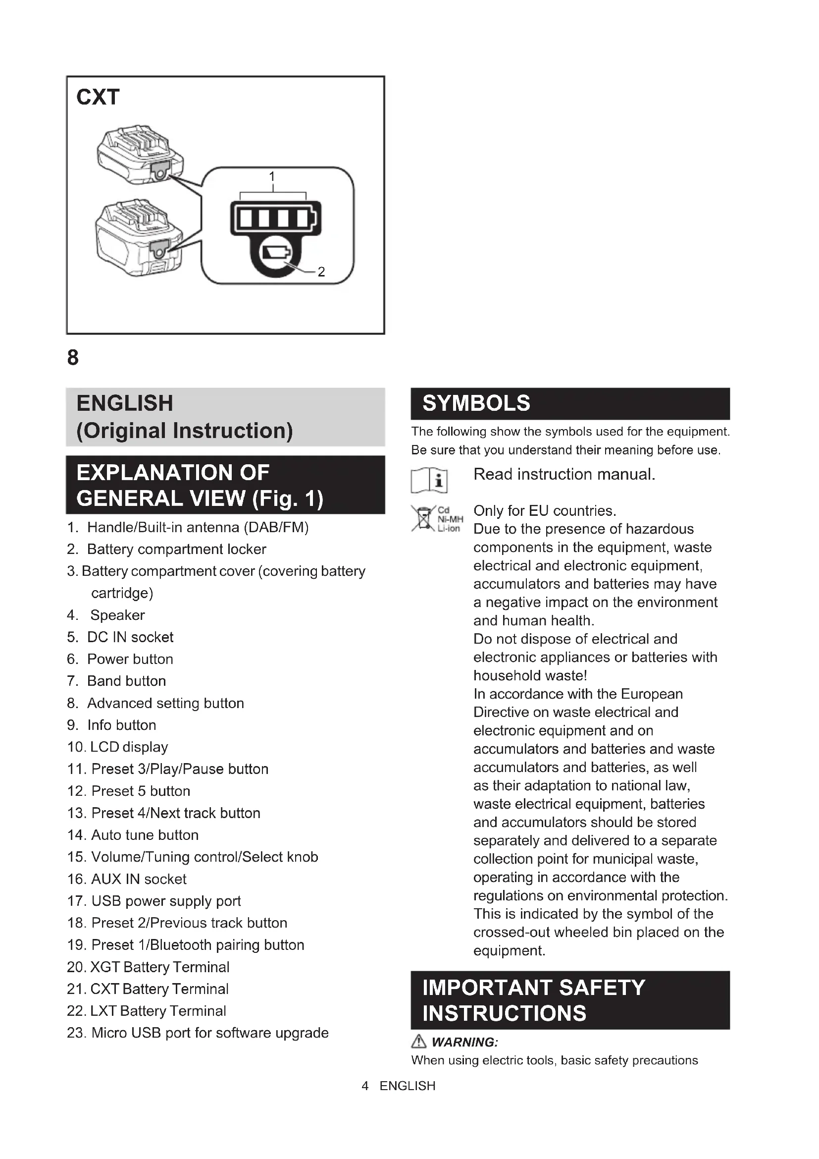 until “SW Version” shows on the display. Press the Volume/Tuning Control/Select knob to view the software version installed in the radio.13 ENGLISH Micro USB port for software upgrade Software updates for your radio may be available in the future. As software updates become available software and information on how to update your radio can be found at Makita website. MAINTENANCE CAUTION: ● Never use gasoline, benzine, thinner, alcohol or the like. Discoloration, deformation or cracks may result. ● Do not wash the radio with water.