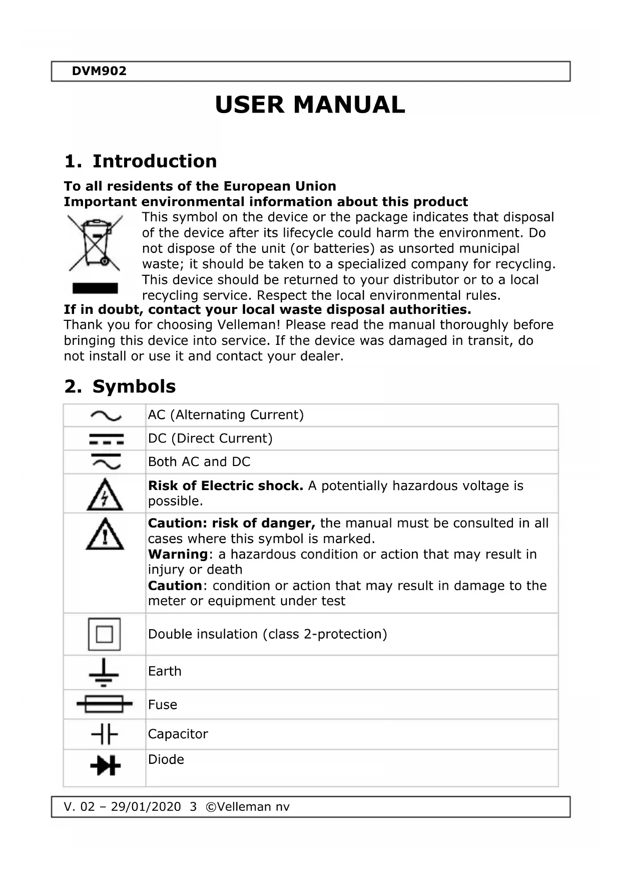 Download the instructions for your Multimeter in PDF format for free! Find your manual DVM902 - VELLEMAN and take your electronic device back in hand. On this page are published all the documents necessary for the use of your device. DVM902 by VELLEMAN.