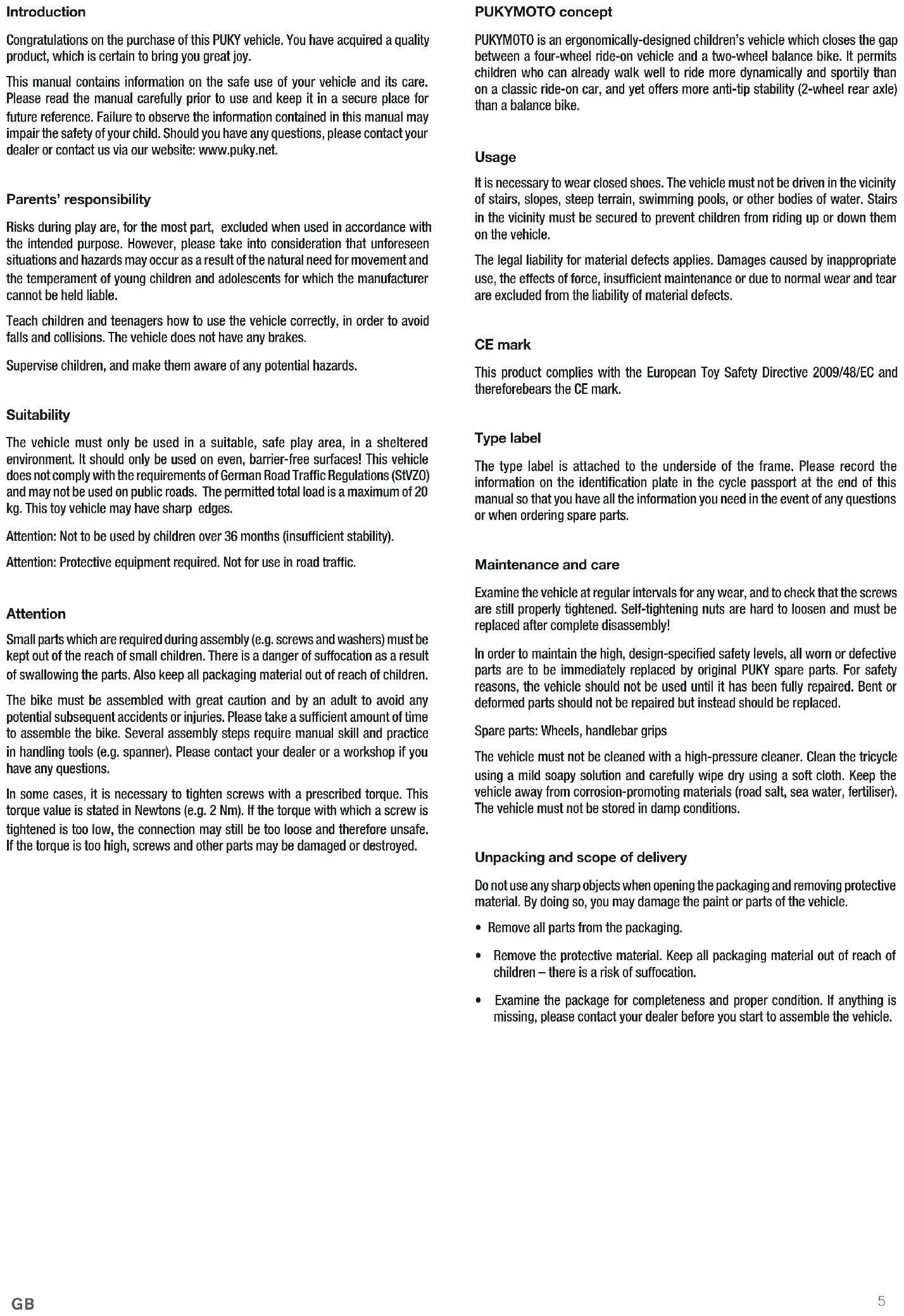 Introduction Congratulations on the purchase of this PUKY vehicle. You have acquired a quality product, which is certain to bring you great joy. This manual contains information on the safe use of your vehicle and its care. Please read the manual carefully prior to use and keep it in a secure place for future reference. Failure to observe the information contained in this manual may impair the safety of your child. Should you have any questions, please contact your dealer or contact us via our website: www.puky.net. Parents’ responsibility Risks during play are, for the most part, excluded when used in accordance with the intended purpose. However, please take into consideration that unforeseen situations and hazards may occur as a result of the natural need for movement and the temperament of young children and adolescents for which the manufacturer cannot be held liable. Teach children and teenagers how to use the vehicle correctly, in order to avoid falls and collisions. The vehicle does not have any brakes. Supervise children, and make them aware of any potential hazards. Suitability The vehicle must only be used in a suitable, safe play area, in a sheltered environment. It should only be used on even, barrier-free surfaces! This vehicle does not comply with the requirements of German Road Trac Regulations (StVZO) and may not be used on public roads. The permitted total load is a maximum of 20 kg. This toy vehicle may have sharp edges. Attention: Not to be used by children over 36 months (insucient stability). Attention: Protective equipment required. Not for use in road trac. Attention Small parts which are required during assembly (e.g. screws and washers) must be kept out of the reach of small children. There is a danger of suocation as a result of swallowing the parts. Also keep all packaging material out of reach of children. The bike must be assembled with great caution and by an adult to avoid any potential subsequent accidents or injuries. Please take a sucient amount of time to assemble the bike. Several assembly steps require manual skill and practice in handling tools (e.g. spanner). Please contact your dealer or a workshop if you have any questions. In some cases, it is necessary to tighten screws with a prescribed torque. This torque value is stated in Newtons (e.g. 2 Nm). If the torque with which a screw is tightened is too low, the connection may still be too loose and therefore unsafe. If the torque is too high, screws and other parts may be damaged or destroyed. PUKYMOTO concept PUKYMOTO is an ergonomically-designed children’s vehicle which closes the gap between a four-wheel ride-on vehicle and a two-wheel balance bike. It permits children who can already walk well to ride more dynamically and sportily than on a classic ride-on car, and yet oers more anti-tip stability (2-wheel rear axle) than a balance bike. Usage It is necessary to wear closed shoes. The vehicle must not be driven in the vicinity of stairs, slopes, steep terrain, swimming pools, or other bodies of water. Stairs in the vicinity must be secured to prevent children from riding up or down them on the vehicle. The legal liability for material defects applies. Damages caused by inappropriate use, the eects of force, insucient maintenance or due to normal wear and tear are excluded from the liability of material defects. CE mark This product complies with the European Toy Safety Directive 2009/48/EC and thereforebears the CE mark. Type label The type label is attached to the underside of the frame. Please record the information on the identification plate in the cycle passport at the end of this manual so that you have all the information you need in the event of any questions or when ordering spare parts. Maintenance and care Examine the vehicle at regular intervals for any wear, and to check that the screws are still properly tightened. Self-tightening nuts are hard to loosen and must be replaced after complete disassembly! In order to maintain the high, design-specified safety levels, all worn or defective parts are to be immediately replaced by original PUKY spare parts. For safety reasons, the vehicle should not be used until it has been fully repaired. Bent or deformed parts should not be repaired but instead should be replaced. Spare parts: Wheels, handlebar grips The vehicle must not be cleaned with a high-pressure cleaner. Clean the tricycle using a mild soapy solution and carefully wipe dry using a soft cloth. Keep the vehicle away from corrosion-promoting materials (road salt, sea water, fertiliser). The vehicle must not be stored in damp conditions. Unpacking and scope of delivery Do not use any sharp objects when opening the packaging and removing protective material. By doing so, you may damage the paint or parts of the vehicle.