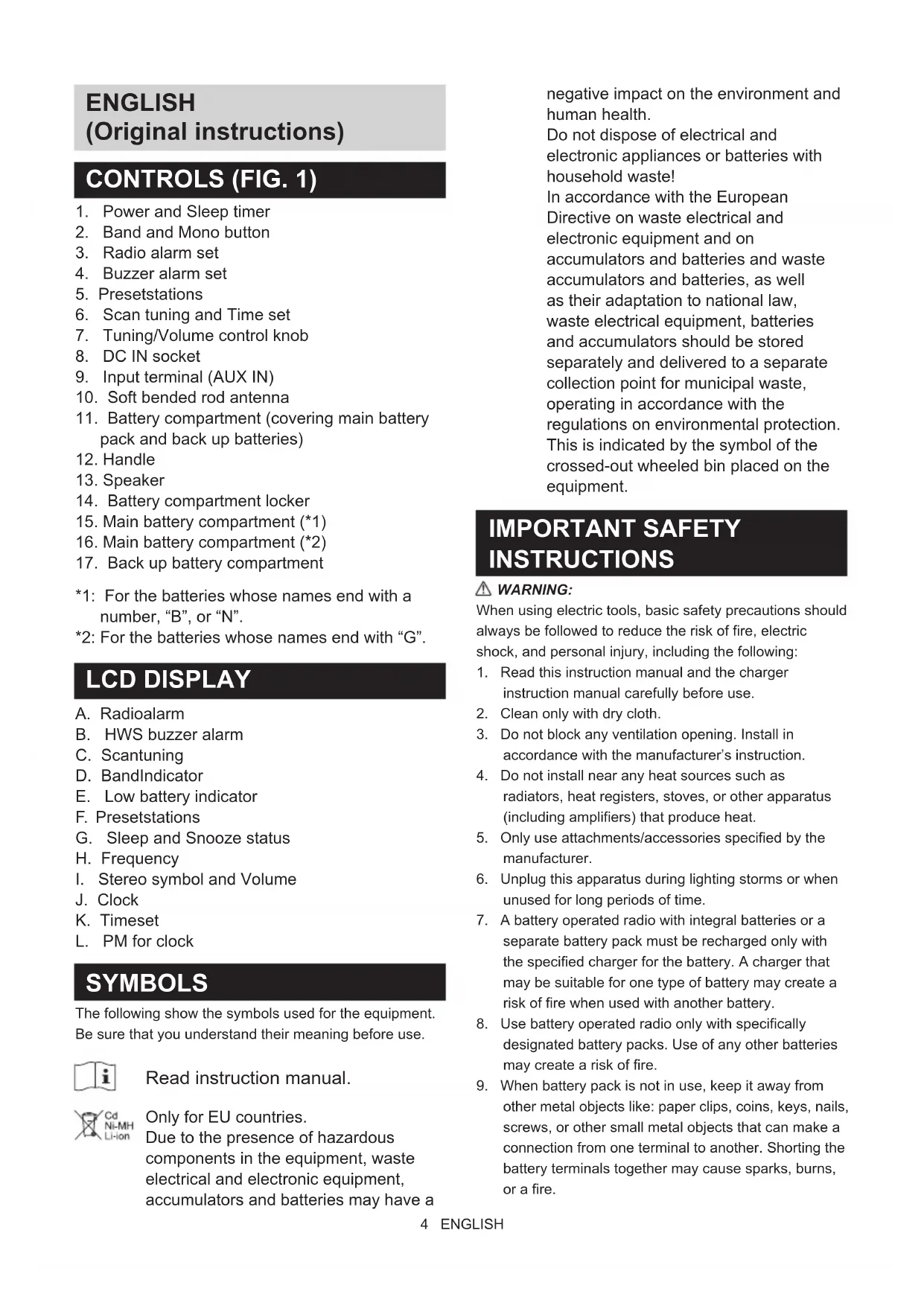 J. Clock K. Time set L. PM for clock SYMBOLS The following show the symbols used for the equipment. Be sure that you understand their meaning before use. Read instruction manual. Only for EU countries. Due to the presence of hazardous components in the equipment, waste electrical and electronic equipment, accumulators and batteries may have a negative impact on the environment and human health. Do not dispose of electrical and electronic appliances or batteries with household waste! In accordance with the European Directive on waste electrical and electronic equipment and on accumulators and batteries and waste accumulators and batteries, as well as their adaptation to national law, waste electrical equipment, batteries and accumulators should be stored separately and delivered to a separate collection point for municipal waste, operating in accordance with the regulations on environmental protection. This is indicated by the symbol of the crossed-out wheeled bin placed on the equipment. IMPORTANT SAFETY INSTRUCTIONS