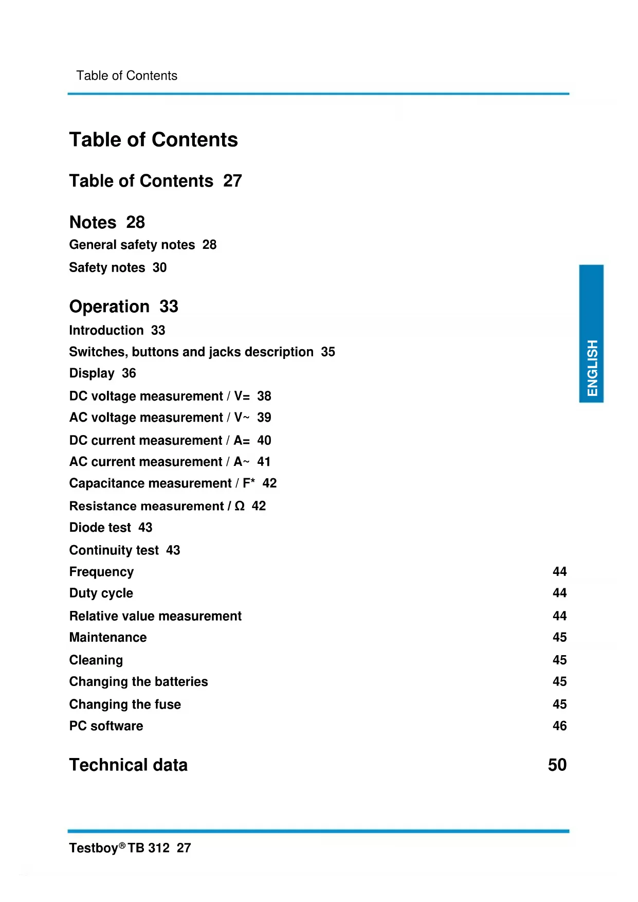 TB 312 27 DEUTSCH ENGLISH Table of Contents Table of Contents 27 Notes 28 General safety notes 28 Safety notes 30 Operation 33 Introduction 33 Switches, buttons and jacks description 35 Display 36 DC voltage measurement / V= 38 AC voltage measurement / V~ 39 DC current measurement / A= 40 AC current measurement / A~ 41 Capacitance measurement / F* 42 Resistance measurement / Ω 42 Diode test 43 Continuity test 43 Frequency 44 Duty cycle 44 Relative value measurement 44 Maintenance 45 Cleaning 45 Changing the batteries 45 Changing the fuse 45 PC software 46 Technical data 50Notes 28 Testboy