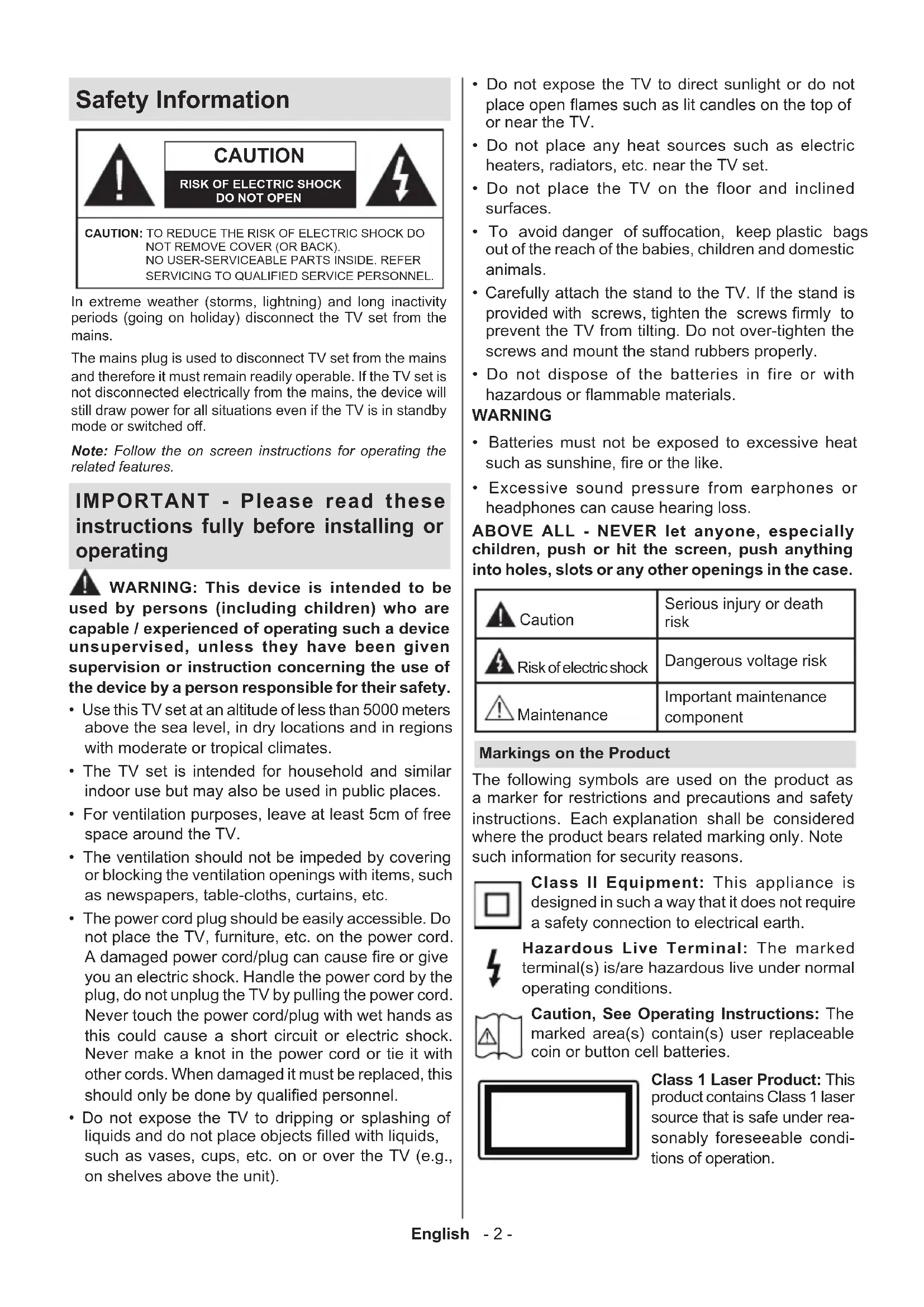 Thank you for choosing our product. You'll soon be enjoying your new TV. Please read these instructions carefully. They contain important information which will help you get the best from your TV and ensure safe and correct installation and operation.