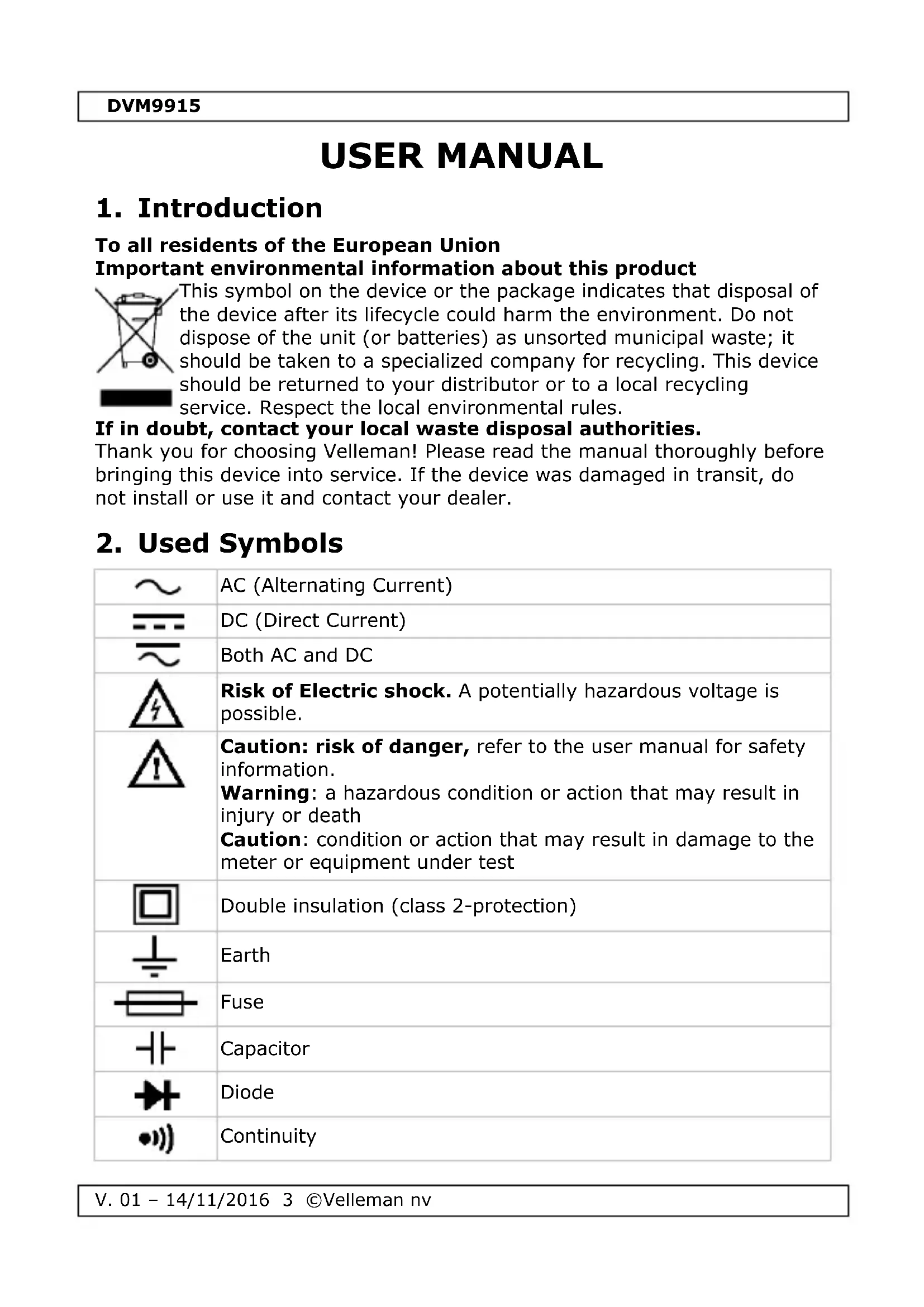 Download the instructions for your Multimeter in PDF format for free! Find your manual DVM9915 - VELLEMAN and take your electronic device back in hand. On this page are published all the documents necessary for the use of your device. DVM9915 by VELLEMAN.