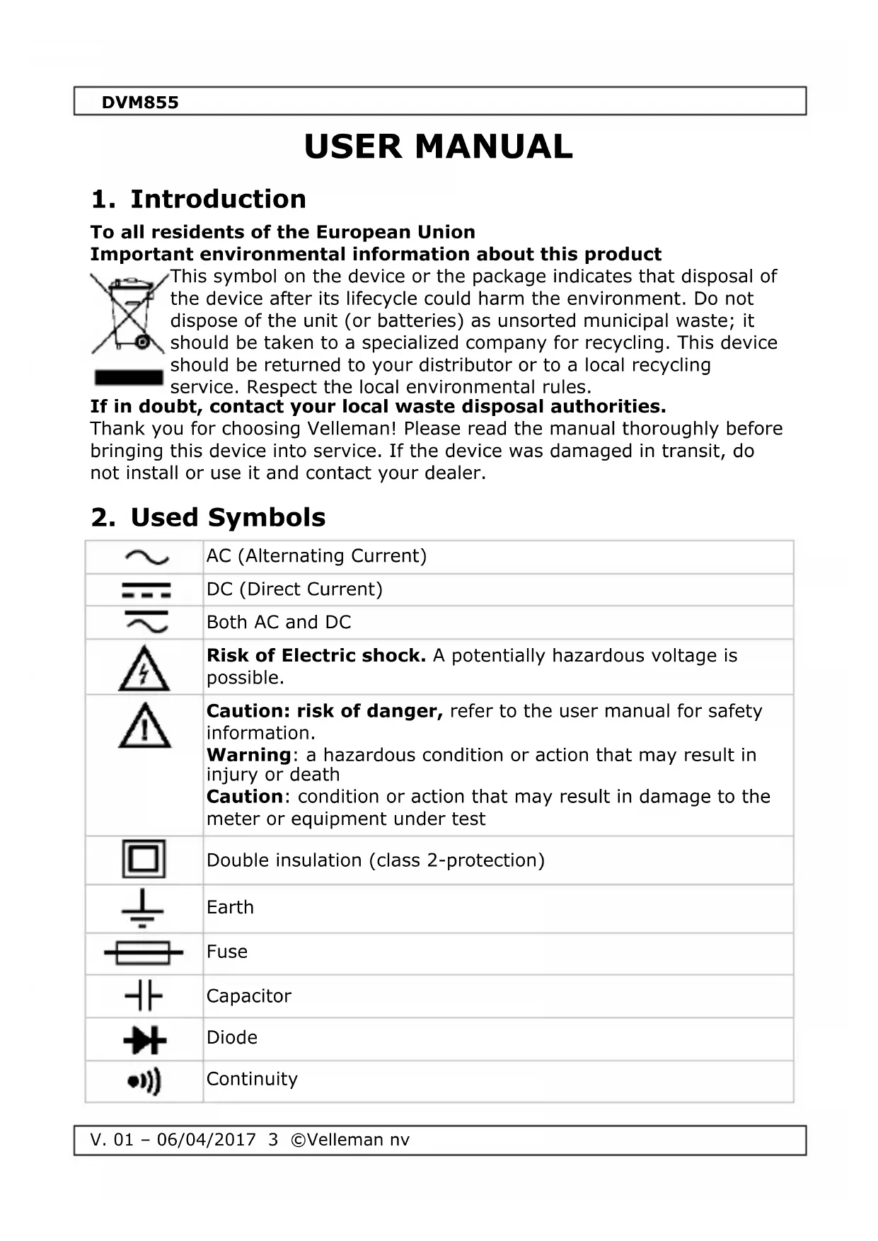 Download the instructions for your Multimeter in PDF format for free! Find your manual DVM855 - VELLEMAN and take your electronic device back in hand. On this page are published all the documents necessary for the use of your device. DVM855 by VELLEMAN.