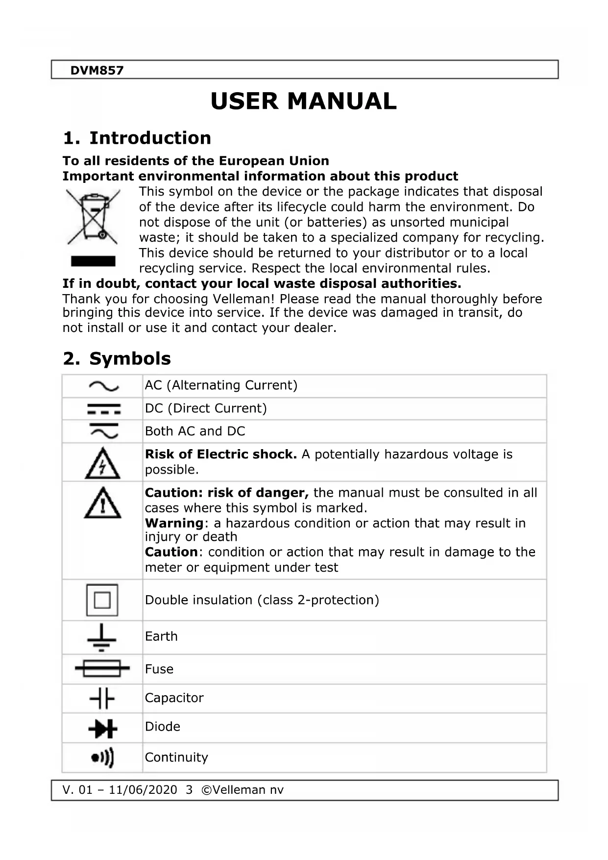 Download the instructions for your Multimeter in PDF format for free! Find your manual DVM857 - VELLEMAN and take your electronic device back in hand. On this page are published all the documents necessary for the use of your device. DVM857 by VELLEMAN.