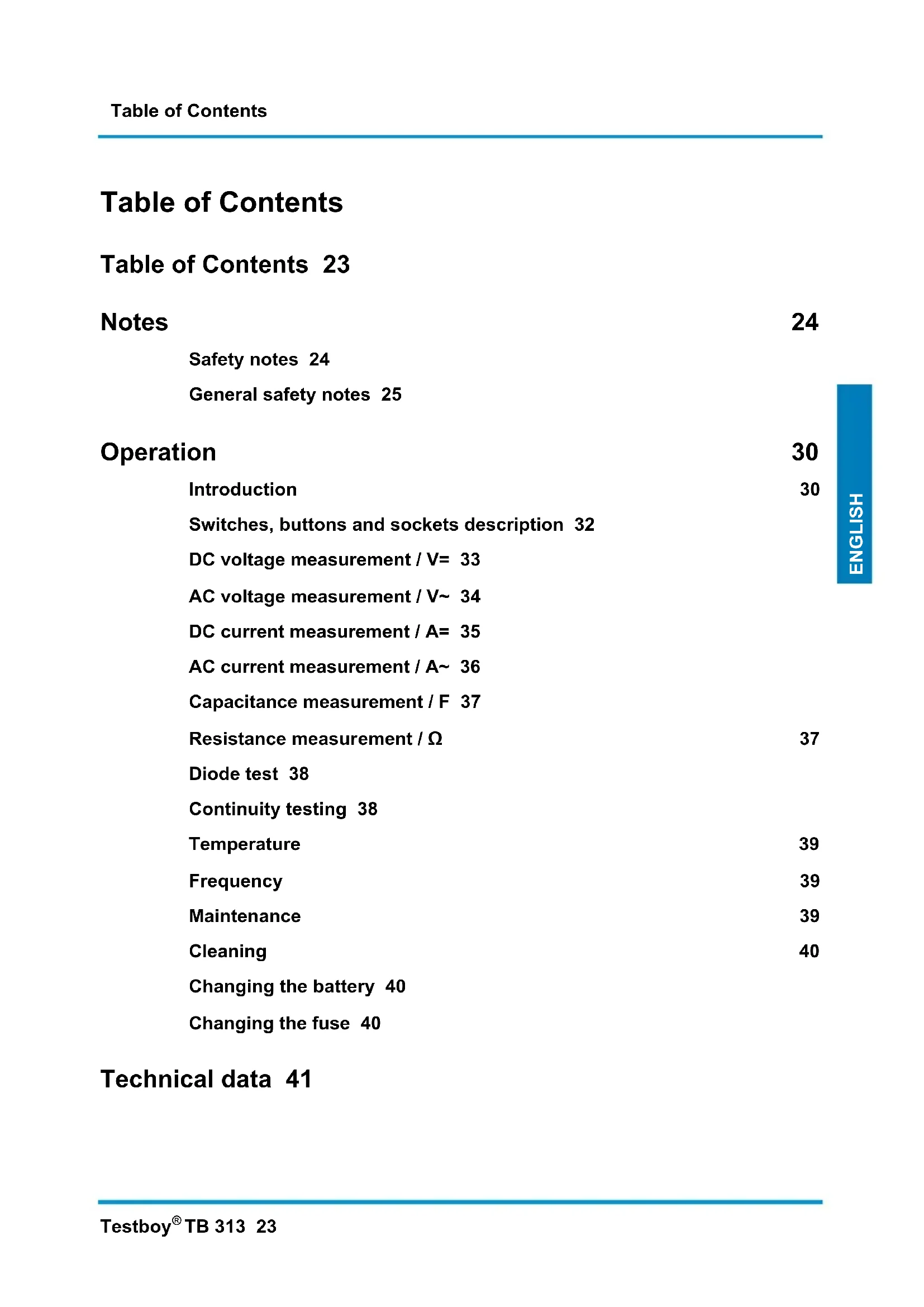 TB 313 23 ENGLISH Table of Contents Table of Contents 23 Notes 24 Safety notes 24 General safety notes 25 Operation 30 Introduction 30 Switches, buttons and sockets description 32 DC voltage measurement / V= 33 AC voltage measurement / V~ 34 DC current measurement / A= 35 AC current measurement / A~ 36 Capacitance measurement / F 37 Resistance measurement / Ω 37 Diode test 38 Continuity testing 38 Temperature 39 Frequency 39 Maintenance 39 Cleaning 40 Changing the battery 40 Changing the fuse 40 Technical data 41Notes 24 Testboy