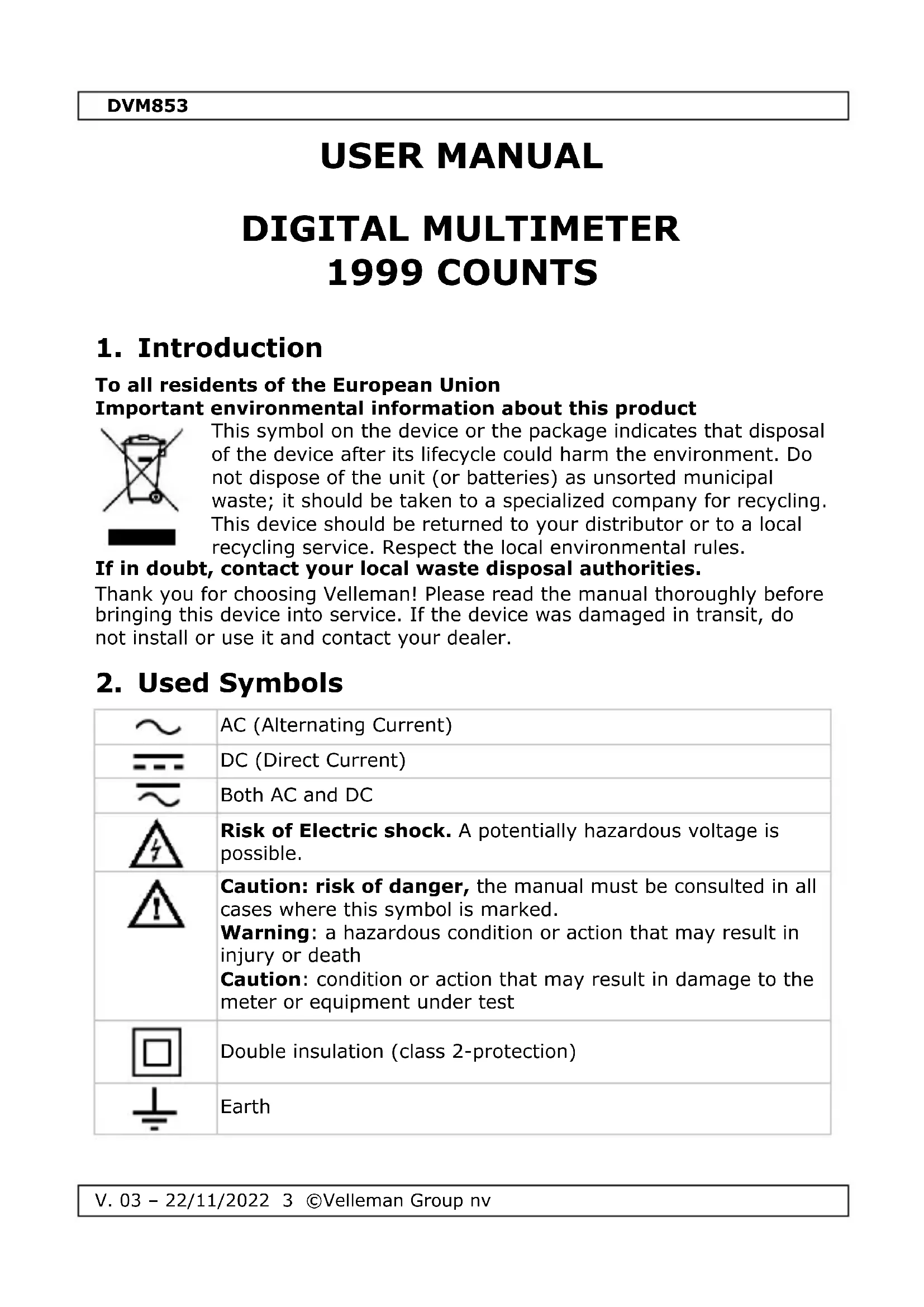 If the device acts abnormal while measuring, this means that the internal fuse is defective. Keep in mind that a low battery level could lead to incorrect measurements. Replace the battery on a regular basis. (tip: the reduced luminosity of the backlight/LCD display indicates a low battery level) Use this device with original accessories only. Velleman Group nv cannot be held responsible in the event of damage or injury resulting from (incorrect) use of this device. For more info concerning this product and the latest version of this manual, please visit our website www.velleman.eu. The information in this manual is subject to change without prior notice. © COPYRIGHT NOTICE The copyright to this manual is owned by Velleman Group nv. All worldwide rights reserved. No part of this manual may be copied, reproduced, translated or reduced to any electronic medium or otherwise without the prior written consent of the copyright holder.DVM853