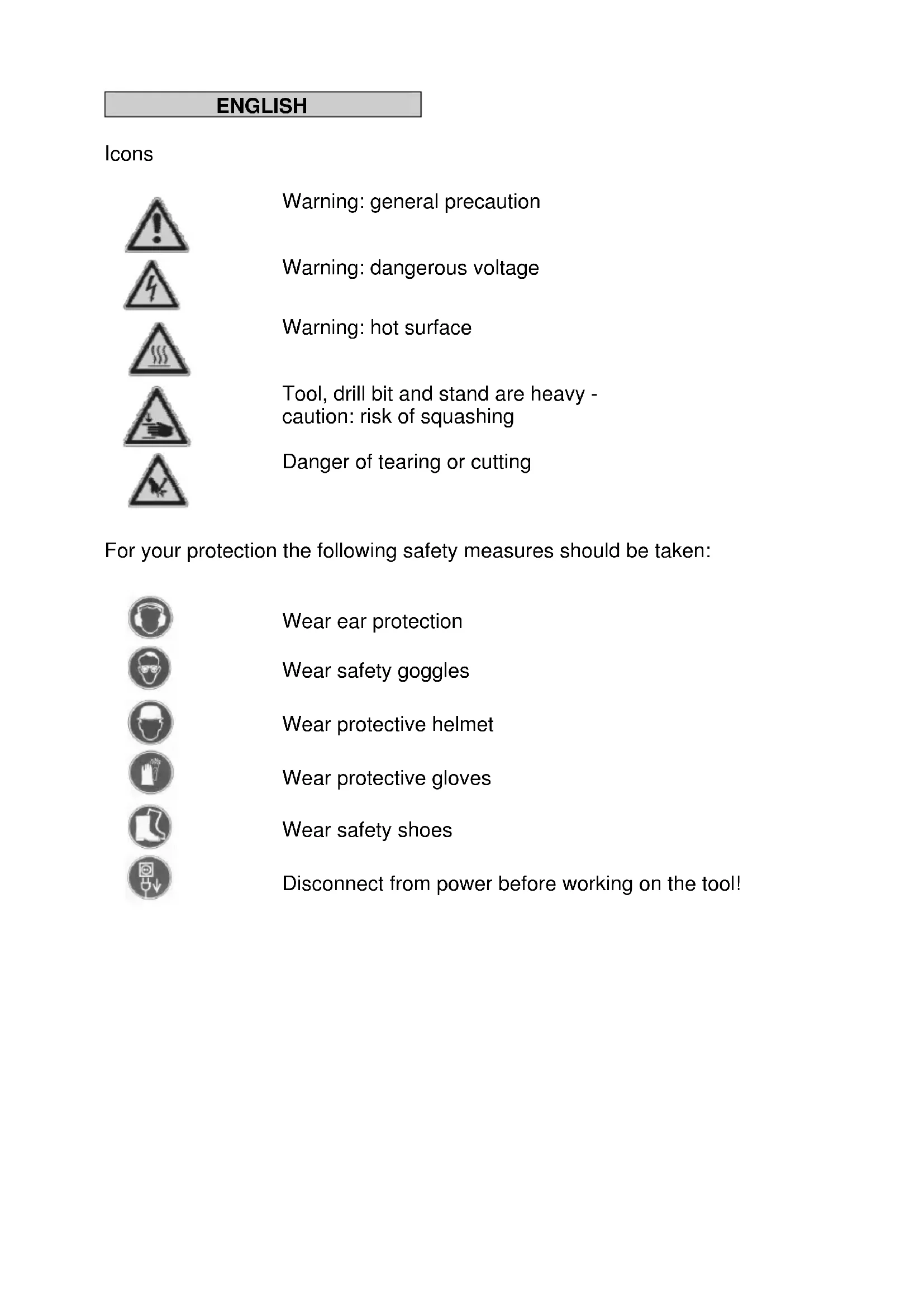 The operator and persons in the vicinity must wear appropriate safety goggles, protective helmet, ear protection, protective gloves and safety shoes during operations. Always work with concentration. Do proceed with consideration and do not operate the tool when not fully concentrated. For further safety instructions refer to the enclosure! Mounting the core drill tool on
