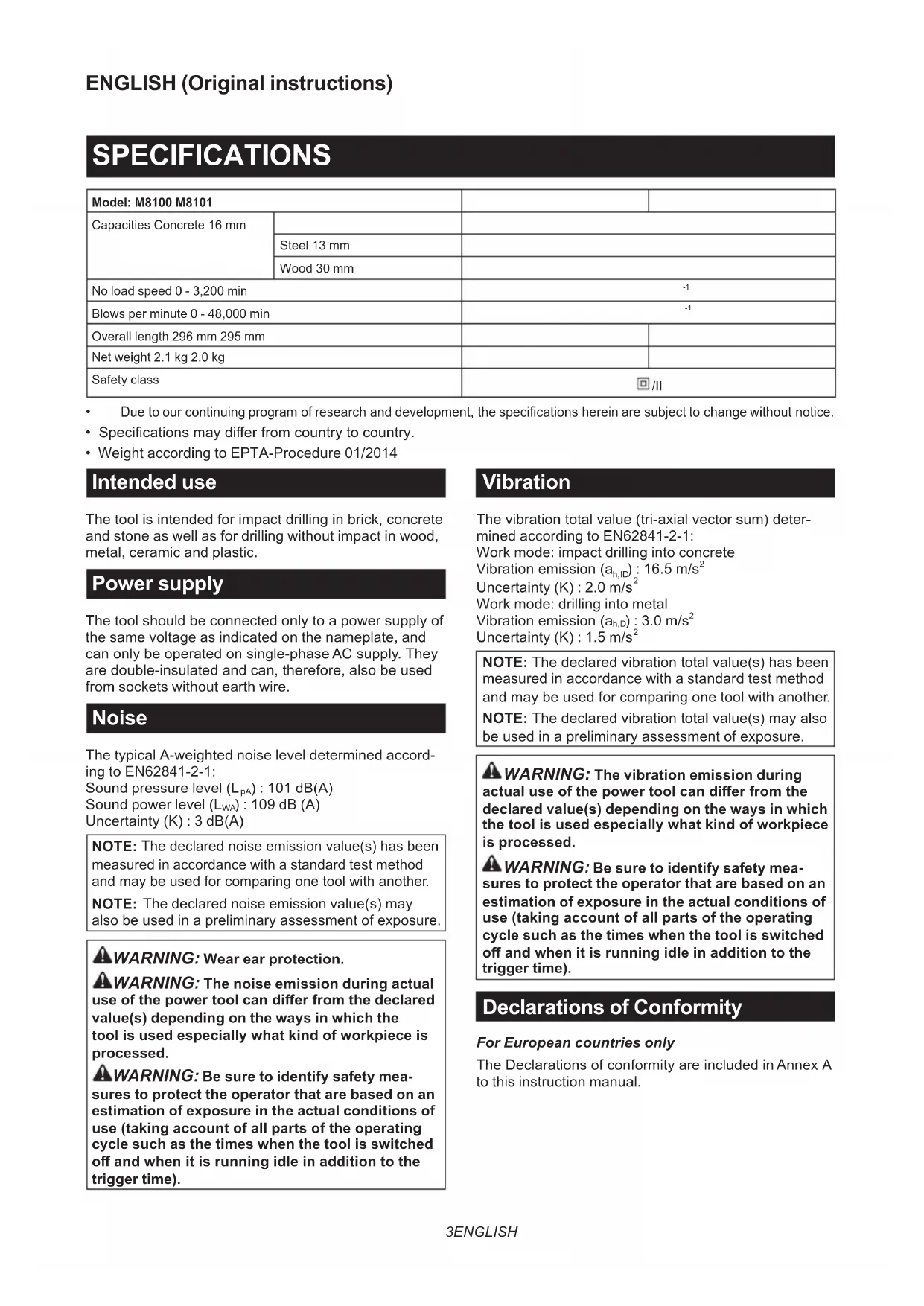 - Weight according to EPTA-Procedure 01/2014 Intended use The tool is intended for impact drilling in brick, concrete and stone as well as for drilling without impact in wood, metal, ceramic and plastic. Power supply The tool should be connected only to a power supply of the same voltage as indicated on the nameplate, and can only be operated on single-phase AC supply. They are double-insulated and can, therefore, also be used from sockets without earth wire. Noise The typical A-weighted noise level determined accord- ing to EN62841-2-1: Sound pressure level (L