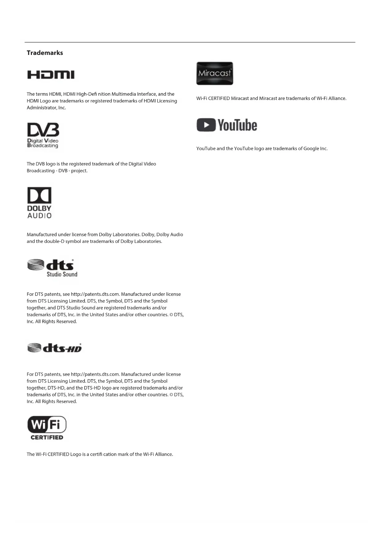 Trademarks The terms HDMI, HDMI High-De nition Multimedia Interface, and the HDMI Logo are trademarks or registered trademarks of HDMI Licensing Administrator, Inc.The DVB logo is the registered trademark of the Digital Video Broadcasting - DVB - project.Manufactured under license from Dolby Laboratories. Dolby, Dolby Audio and the double-D symbol are trademarks of Dolby Laboratories.For DTS patents, see http://patents.dts.com. Manufactured under license from DTS Licensing Limited. DTS, the Symbol, DTS and the Symbol together, and DTS Studio Sound are registered trademarks and/or trademarks of DTS, Inc. in the United States and/or other countries. © DTS, Inc. All Rights Reserved.For DTS patents, see http://patents.dts.com. Manufactured under license from DTS Licensing Limited. DTS, the Symbol, DTS and the Symbol together, DTS-HD, and the DTS-HD logo are registered trademarks and/or trademarks of DTS, Inc. in the United States and/or other countries. © DTS, Inc. All Rights Reserved.The Wi-Fi CERTIFIED Logo is a certi cation mark of the Wi-Fi Alliance.Wi-Fi CERTIFIED Miracast and Miracast are trademarks of Wi-Fi Alliance.YouTube and the YouTube logo are trademarks of Google Inc.EN Remote control