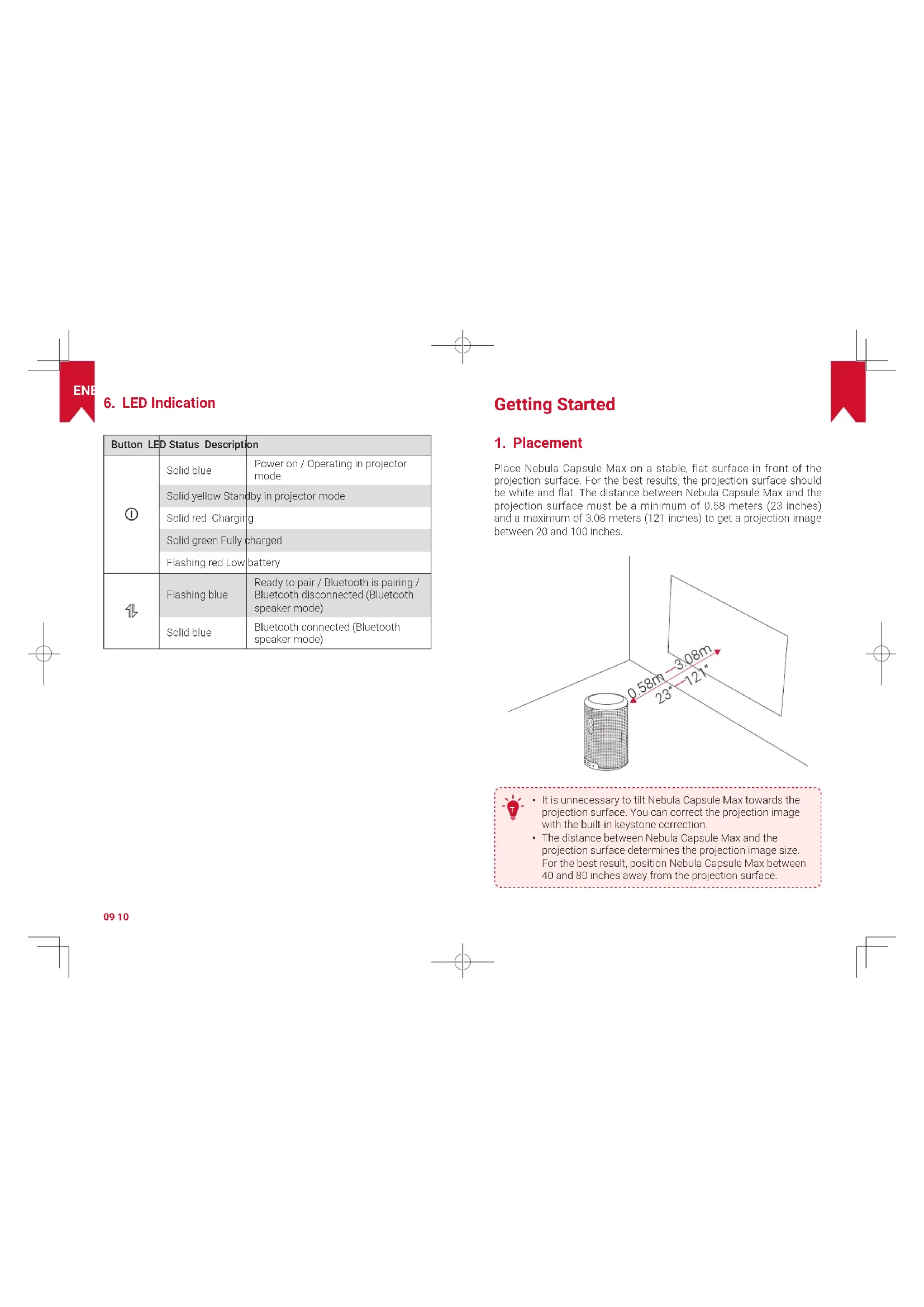 Place Nebula Capsule Max on a stable, flat surface in front of the projection surface. For the best results, the projection surface should be white and flat. The distance between Nebula Capsule Max and the projection surface must be a minimum of 0.58 meters (23 inches) and a maximum of 3.08 meters (121 inches) to get a projection image between 20 and 100 inches.