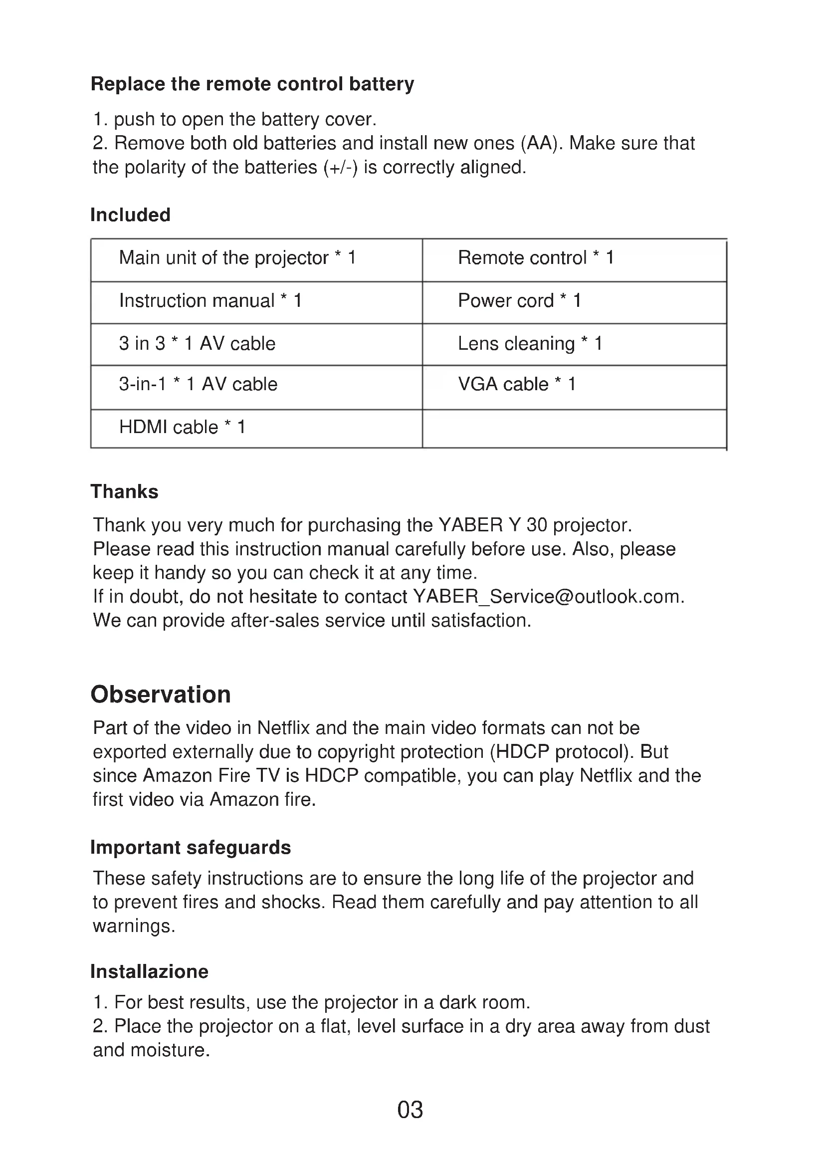 87 88Thanks Thank you very much for purchasing the YABER Y 30 projector. Please read this instruction manual carefully before use. Also, please keep it handy so you can check it at any time. If in doubt, do not hesitate to contact YABER_Service@outlook.com. We can provide after-sales service until satisfaction. Observation Part of the video in Netflix and the main video formats can not be exported externally due to copyright protection (HDCP protocol). But since Amazon Fire TV is HDCP compatible, you can play Netflix and the first video via Amazon fire. Replace the remote control battery