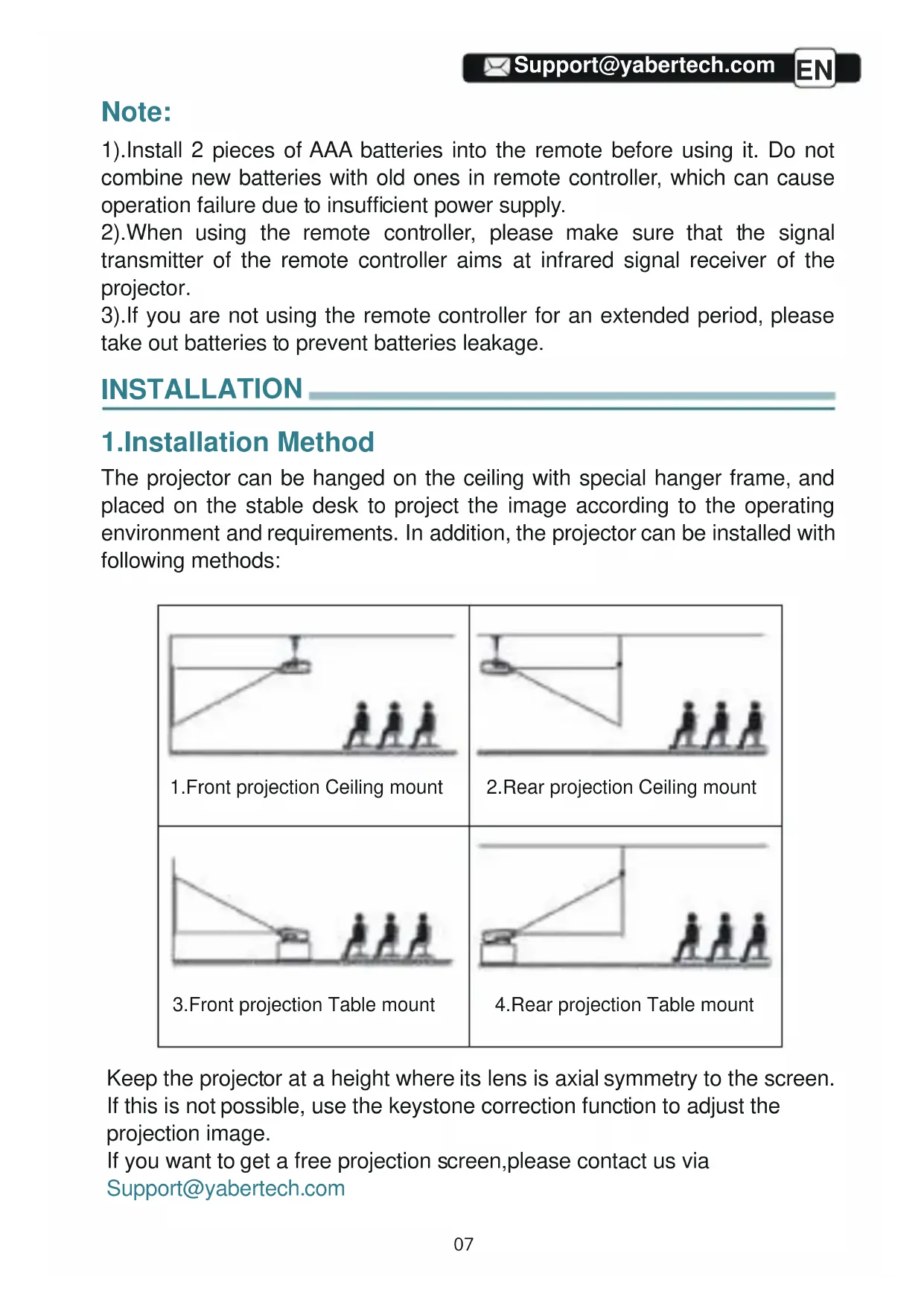 Note: 1).Install 2 pieces of AAA batteries into the remote before using it. Do not combine new batteries with old ones in remote controller, which can cause operation failure due to insufficient power supply. 2).When using the remote controller, please make sure that the signal transmitter of the remote controller aims at infrared signal receiver of the projector. 3).If you are not using the remote controller for an extended period, please take out batteries to prevent batteries leakage. INSTALLATION 1.Installation Method The projector can be hanged on the ceiling with special hanger frame, and placed on the stable desk to project the image according to the operating environment and requirements. In addition, the projector can be installed with following methods: 1.Front projection Ceiling mount 3.Front projection Table mount 2.Rear projection Ceiling mount 4.Rear projection Table mount Keep the projector at a height where its lens is axial symmetry to the screen. If this is not possible, use the keystone correction function to adjust the projection image. If you want to get a free projection screen,please contact us via Support@yabertech.com Support@yabertech.com