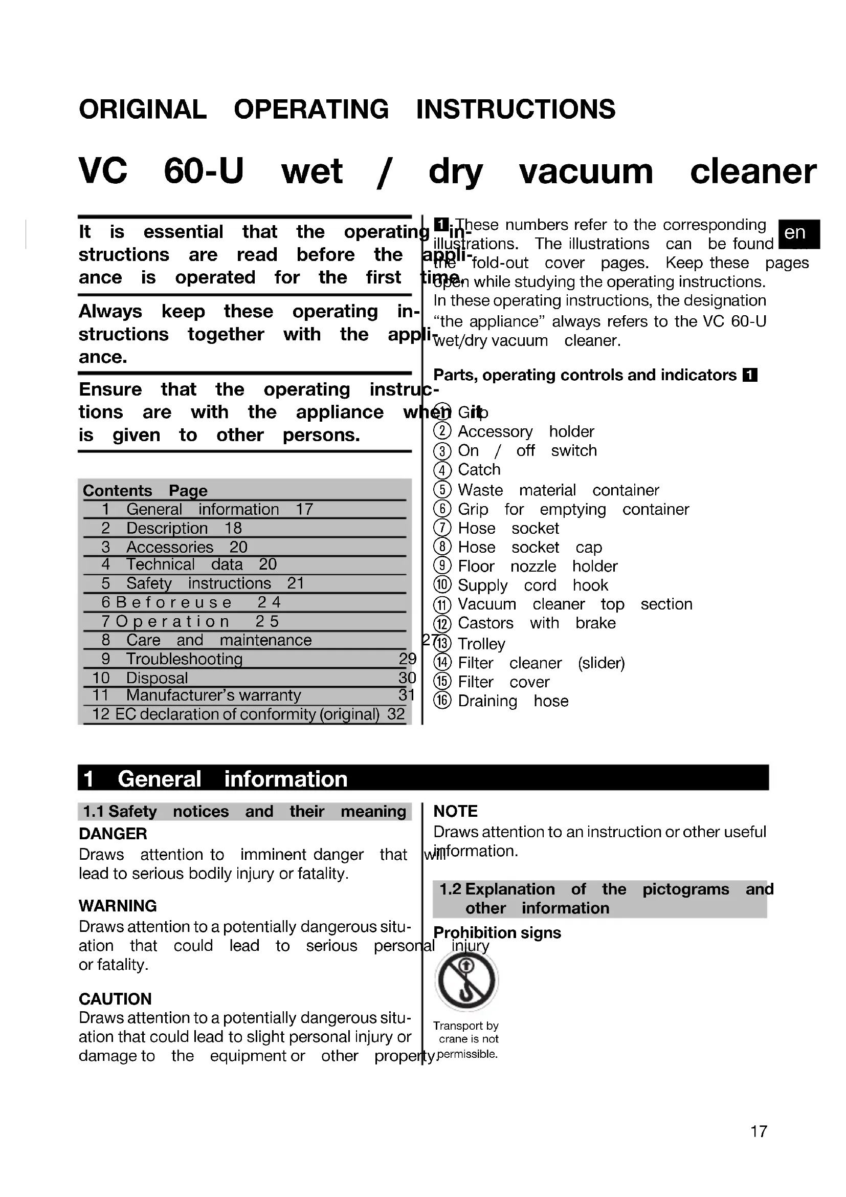 Printed: 05.12.2013 | Doc-Nr: PUB / 5071295 / 000 / 02ORIGINAL OPERATING INSTRUCTIONS VC 60‑U wet / dry vacuum cleaner It is essential that the operating in-structions are read before the appli-ance is operated for the first time.Always keep these operating in-structions together with the appli-ance.Ensure that the operating instruc-tions are with the appliance when itis given to other persons.Contents Page1 General information 172 Description 183 Accessories 204 Technical data 205 Safety instructions 216Beforeuse 247Operation 258 Care and maintenance 279 Troubleshooting 2910 Disposal 3011 Manufacturer’s warranty 31 12 EC declaration of conformity (original) 32 1 These numbers refer to the corresponding illustrations. The illustrations can be found onthe fold-out cover pages. Keep these pages open while studying the operating instructions. In these operating instructions, the designation “the appliance” always refers to the VC 60‑U wet/dry vacuum cleaner. Parts, operating controls and indicators 1