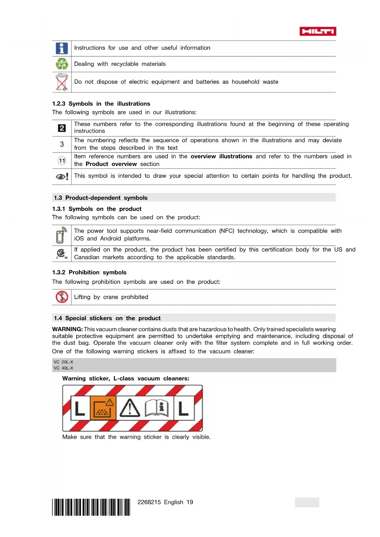 The products described here are industrial vacuum cleaners designed for universal, commercial use. They may be used for wet or dry applications. Use of the product to clean down persons or animals is not permissible. Underwater use is not permissible. ▶ Before beginning work with the product, find out how to operate it correctly and about any hazards associated with the materials you will be working with and how these materials can be disposed of safely. ▶ Do not use the product for continuous, stationary operation in automatic or semi-automatic systems. ▶ To reduce the risk of injury, use only genuine Hilti accessories and accessory tools. ▶ Use an anti-static suction hose in order to avoid electrostatic effects. ▶ Do not vacuum up objects or materials that could cause injury by piercing through the dust bag (e.g. pointed or sharp objects). ▶ Do not stand on the product (do not use it as a substitute for a ladder). ▶ Comply with the accident prevention regulations applicable in your country. Permissible applications: With vacuum cleaners it is necessary to ensure an adequate rate of air exchange (L) in the room in situations where the expelled air is returned to the room. Comply with national regulations! ▶ Vacuuming up large quantities of dust from work with Hilti diamond grinders, cut-off saws, rotary hammers and core drilling machines using dry-cutting core bits. ▶ Vacuuming up mineral drilling slurry from working with Hilti diamond core bits or Hilti diamond saws, and liquids up to a temperature of max. 60 °C (140 °F). ▶ Vacuuming up oil and liquid media up to a temperature of max. 60 °C (140 °F). ▶ Wet and dry cleaning of wall and floor surfaces.24 English 2268215 *2268215* VC 20M-X VC 40M-X Additionally in the case of M-class vacuum cleaners ▶ Collecting dry, non-flammable dusts, liquids, wood shavings and hazardous dusts with an exposure limit value of ≧ 0.1 mg/m³ (dust class M). ▶ Machines designed for picking up mineral dust containing quartz must correspond to at least dust class M. VC 20L-X VC 40L-X Additionally in the case of L-class vacuum cleaners ▶ Vacuuming up dry, non-flammable dusts, liquids, wood shavings and hazardous dusts with an exposure limit value of > 1 mg/m³ (dust class L).