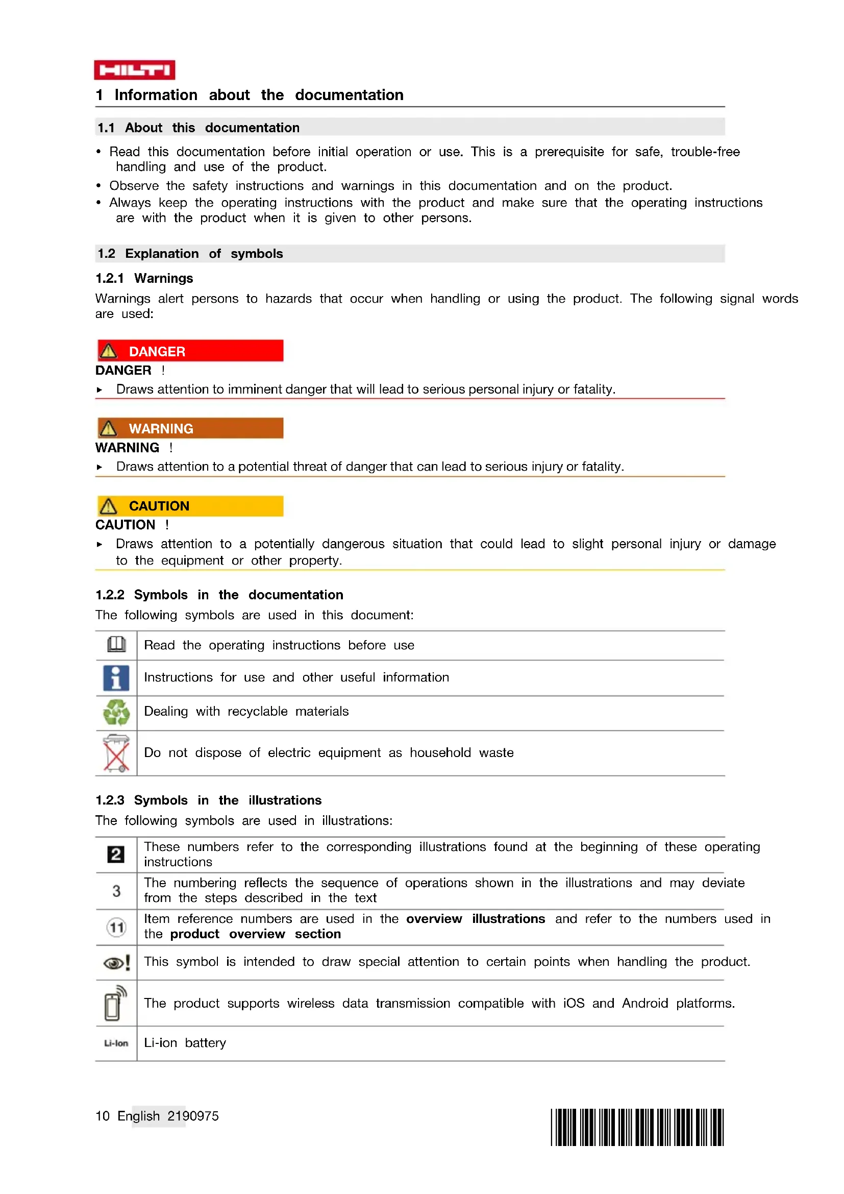 The following symbols are used in illustrations: These numbers refer to the corresponding illustrations found at the beginning of these operating instructions The numbering reflects the sequence of operations shown in the illustrations and may deviate from the steps described in the text Item reference numbers are used in the overview illustrations and refer to the numbers used in the product overview section This symbol is intended to draw special attention to certain points when handling the product. The product supports wireless data transmission compatible with iOS and Android platforms. Li-ion battery*2190975* 2190975 English 11 Hilti Li-ion battery type series used. Observe the information given in the section headed In- tended use. Never use the battery as a striking tool. Do not drop the battery. Never use a battery that has suffered an impact or is damaged in any other way.