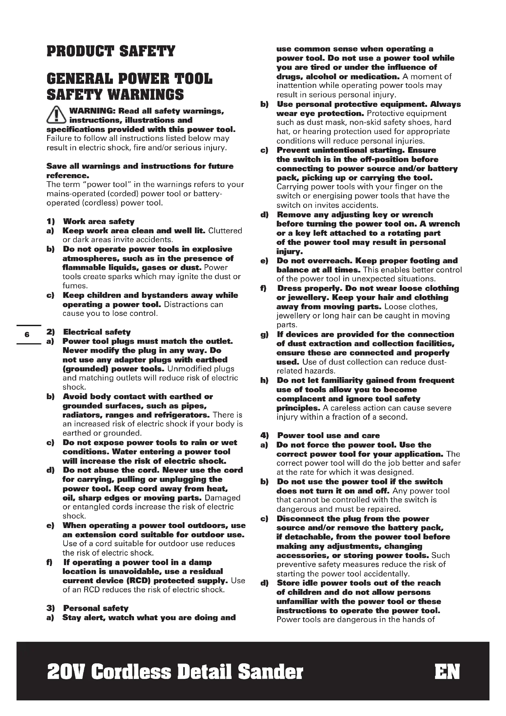 a) Do not force the power tool. Use the correct power tool for your application. The correct power tool will do the job better and safer at the rate for which it was designed. b) Do not use the power tool if the switch does not turn it on and off. Any power tool that cannot be controlled with the switch is dangerous and must be repaired. c) Disconnect the plug from the power source and/or remove the battery pack, if detachable, from the power tool before making any adjustments, changing accessories, or storing power tools. Such preventive safety measures reduce the risk of starting the power tool accidentally. d) Store idle power tools out of the reach of children and do not allow persons unfamiliar with the power tool or these instructions to operate the power tool. Power tools are dangerous in the hands of7 20V Cordless Detail Sander EN untrained users. e) Maintain power tools and accessories. Check for misalignment or binding of moving parts, breakage of parts and any other condition that may affect the power tool’s operation. If damaged, have the power tool repaired before use. Many accidents are caused by poorly maintained power tools. f) Keep cutting tools sharp and clean. Properly maintained cutting tools with sharp cutting edges are less likely to bind and are easier to control. g) Use the power tool, accessories and tool bits etc. in accordance with these instructions, taking into account the working conditions and the work to be performed. Use of the power tool for operations different from those intended could result in a hazardous situation. h) Keep handles and grasping surfaces dry, clean and free from oil and grease. Slippery handles and grasping surfaces do not allow for safe handling and control of the tool in unexpected situations.