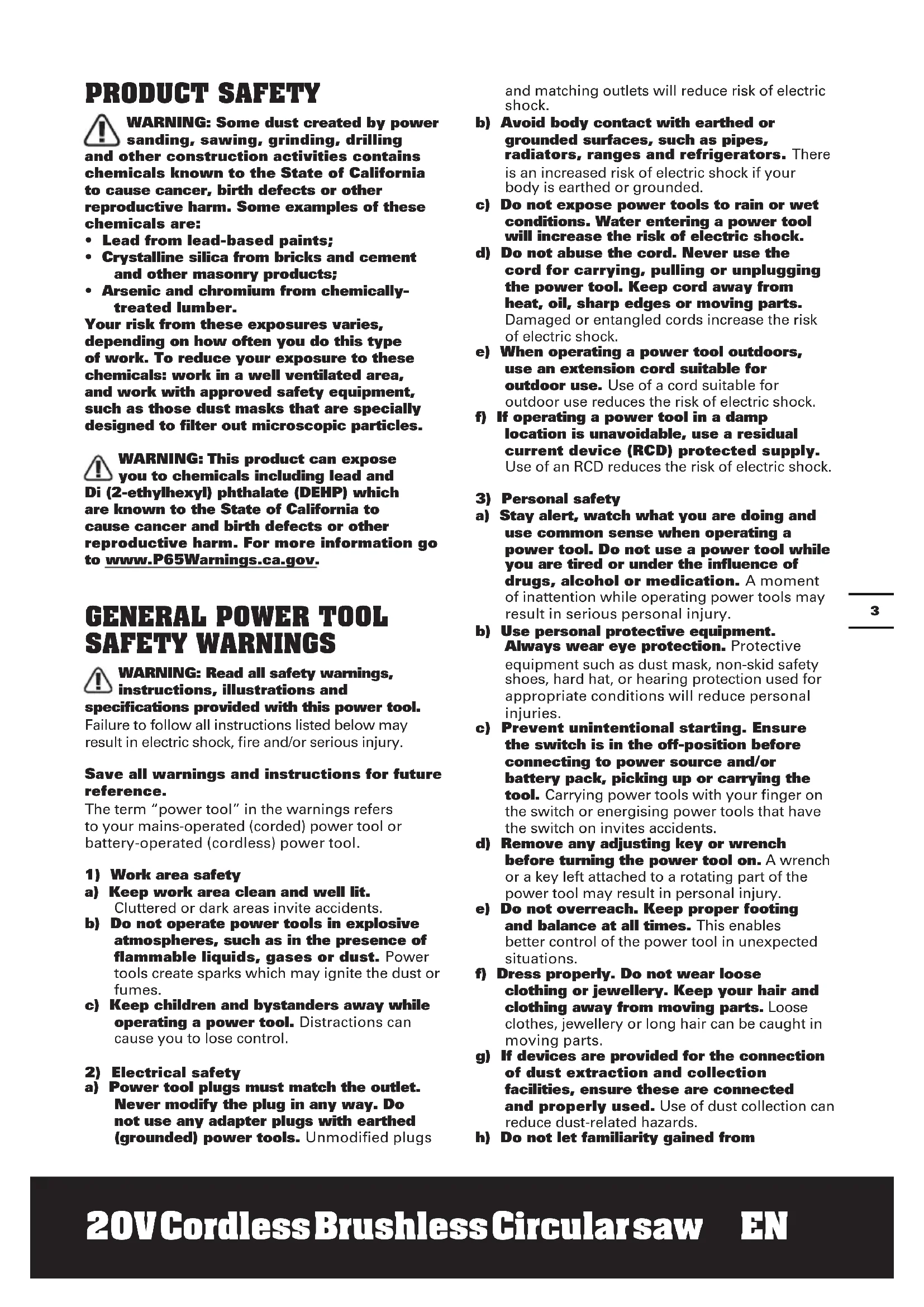 BATTERY PACK a) Do not dismantle, open or shred battery pack. b) Do not expose battery pack to heat or fire. Avoid storage in direct sunlight. c) Do not short-circuit a battery pack. Do not store battery packs haphazardly in a box or drawer where they may short- circuit each other or be short-circuited by other metal objects. When battery pack is not in use, keep it away from other metal objects, like paper clips, coins, keys, nails, screws or other small metal objects, that can make a connection from one terminal to another. Shorting the battery terminals together may cause burns or fire. d) Do not remove battery pack from its original packaging until required for use. e) Do not subject battery pack to mechanical shock. f) In the event of battery leaking, do not allow the liquid to come in contact with the skin or eyes. If contact has been made, wash the affected area with copious amounts of water and seek medical advice. g) Observe the plus (+) and minus (–) marks on the battery back and equipment and ensure correct use. h) Do not use any battery pack which is not20V Cordless Brushless Circular saw EN