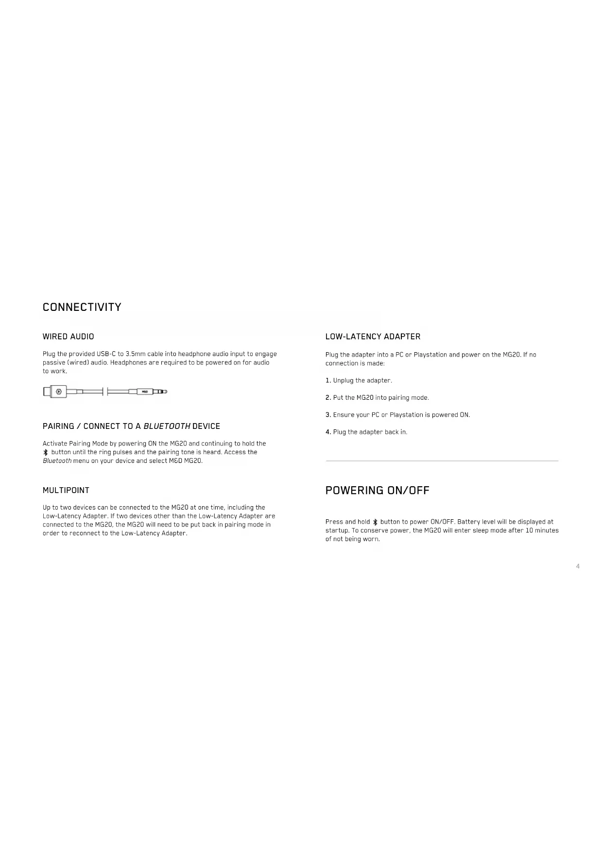 Activate Pairing Mode by powering ON the MG20 and continuing to hold the button until the ring pulses and the pairing tone is heard. Access the Bluetooth menu on your device and select M&D MG20. LOW-LATENCY ADAPTER MULTIPOINT Up to two devices can be connected to the MG20 at one time, including the Low-Latency Adapter. If two devices other than the Low-Latency Adapter are connected to the MG20, the MG20 will need to be put back in pairing mode in order to reconnect to the Low-Latency Adapter.