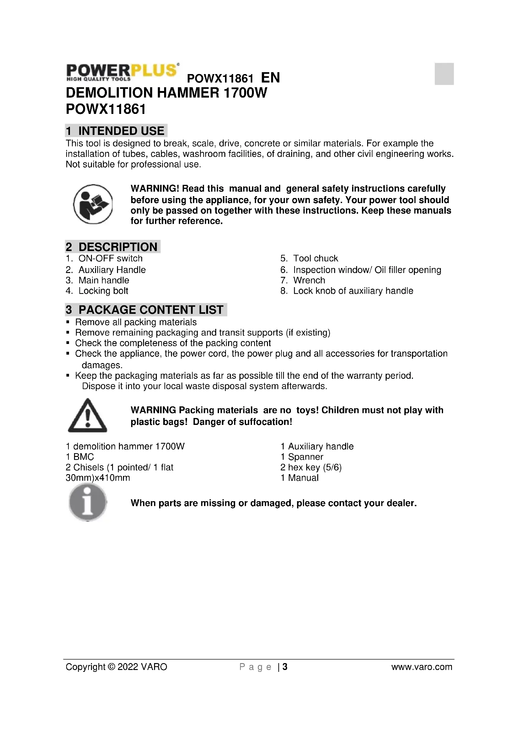 - Keep the packaging materials as far as possible till the end of the warranty period. Dispose it into your local waste disposal system afterwards. WARNING Packing materials are no toys! Children must not play with plastic bags! Danger of suffocation! 1 demolition hammer 1700W 1 BMC 2 Chisels (1 pointed/ 1 flat 30mm)x410mm 1 Auxiliary handle 1 Spanner 2 hex key (5/6) 1 Manual When parts are missing or damaged, please contact your dealer.POWX11861 EN Copyright © 2022 VARO P a g e | 4 www.varo.com 4 SYMBOLS The following symbols are used in this manual and/or on the machine: