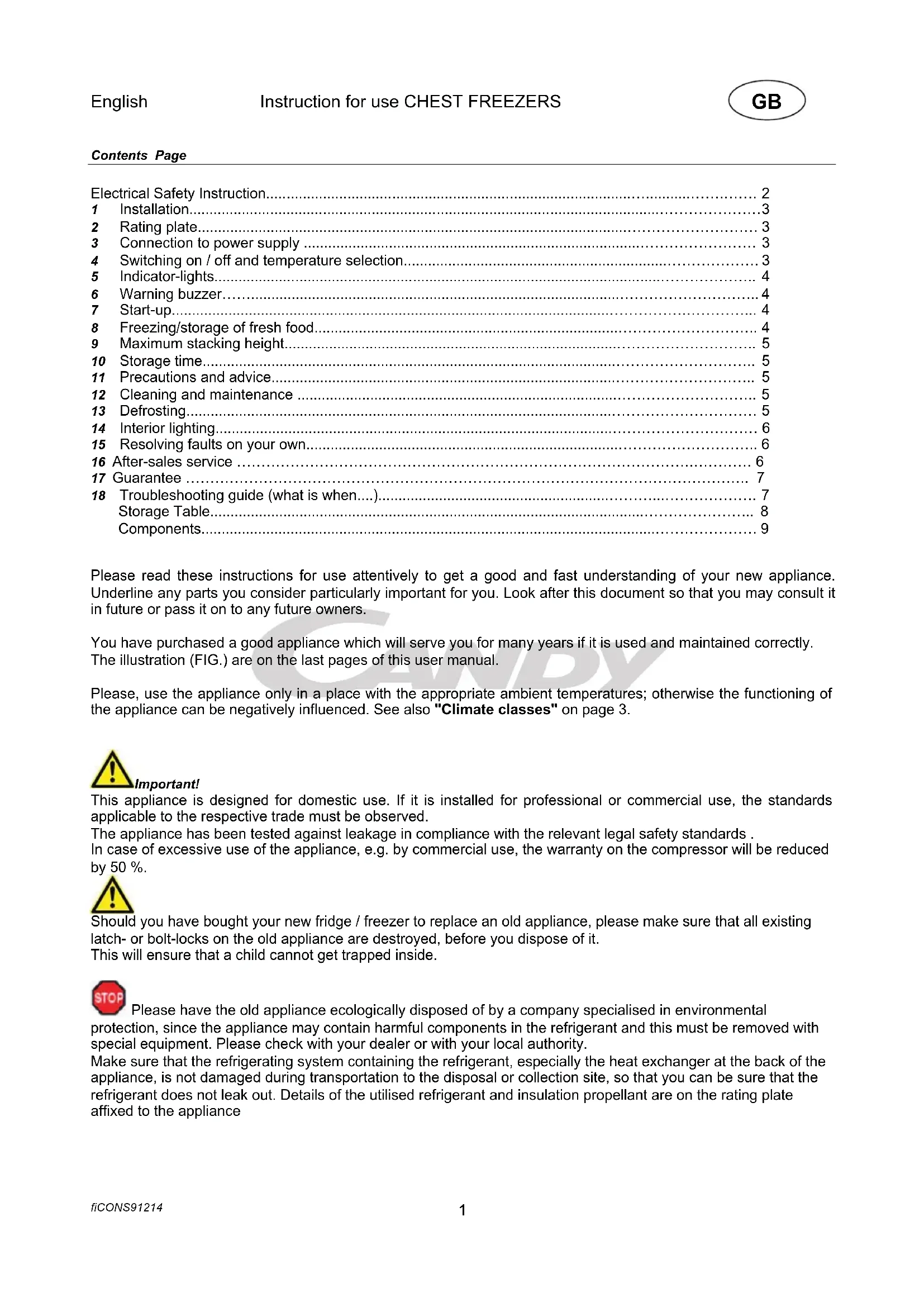 Important! This appliance is designed for domestic use. If it is installed for professional or commercial use, the standards applicable to the respective trade must be observed. The appliance has been tested against leakage in compliance with the relevant legal safety standards . In case of excessive use of the appliance, e.g. by commercial use, the warranty on the compressor will be reduced by 50 %. Should you have bought your new fridge / freezer to replace an old appliance, please make sure that all existing latch- or bolt-locks on the old appliance are destroyed, before you dispose of it. This will ensure that a child cannot get trapped inside. Please have the old appliance ecologically disposed of by a company specialised in environmental protection, since the appliance may contain harmful components in the refrigerant and this must be removed with special equipment. Please check with your dealer or with your local authority. Make sure that the refrigerating system containing the refrigerant, especially the heat exchanger at the back of the appliance, is not damaged during transportation to the disposal or collection site, so that you can be sure that the refrigerant does not leak out. Details of the utilised refrigerant and insulation propellant are on the rating plate affixed to the applianceEnglish Instruction for use CHEST FREEZERS fiCONS91214