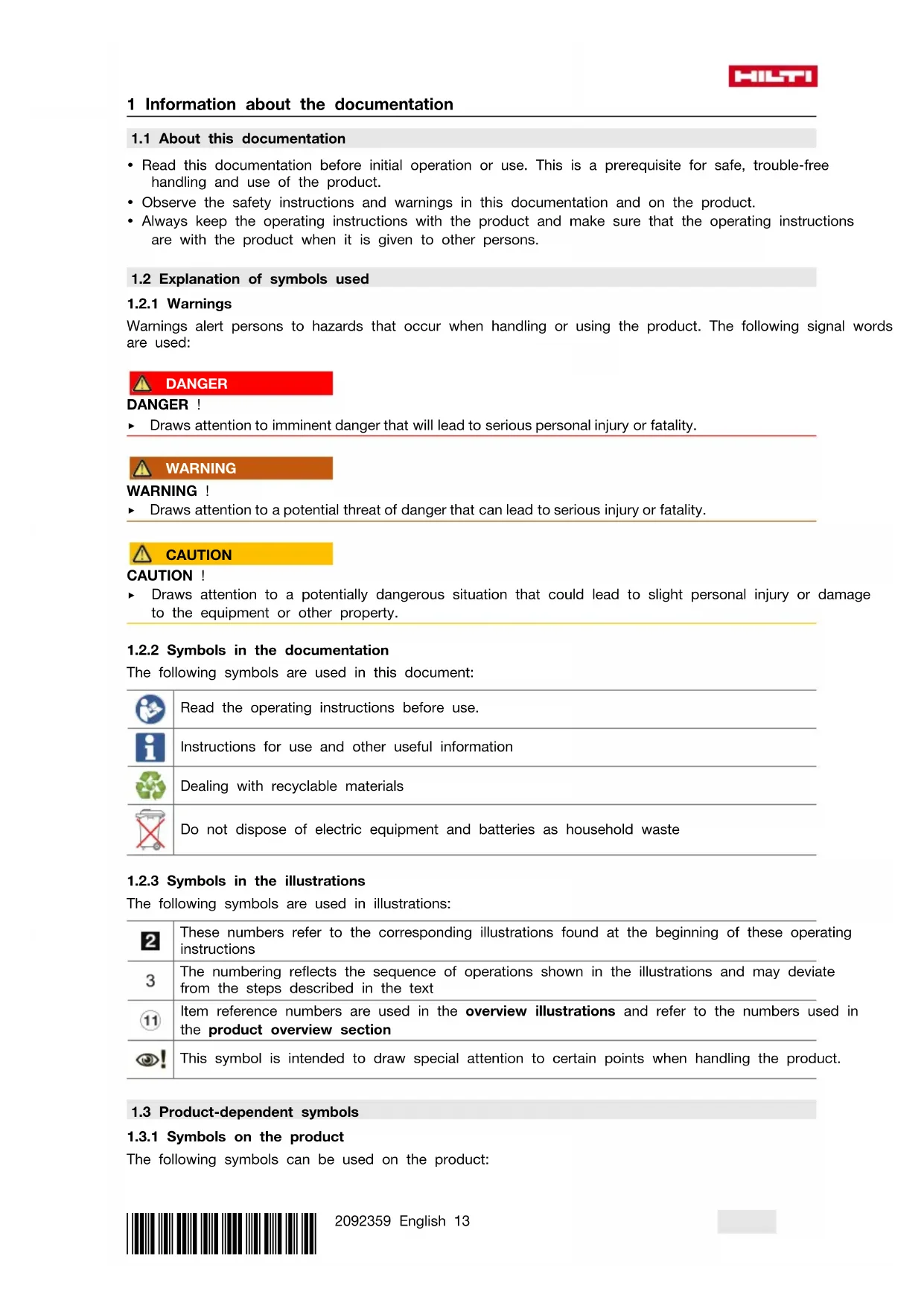 We declare, on our sole responsibility, that the product described here complies with the applicable directives and standards. A copy of the declaration of conformity can be found at the end of this documentation. The technical documentation is filed here: Hilti Entwicklungsgesellschaft mbH | Tool Certification | Hiltistrasse 6 | D-86916 Kaufering, Germany 2 Safety