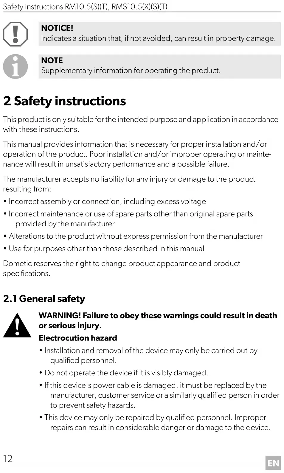 - This device may only be repaired by qualified personnel. Improper repairs can result in considerable danger or damage to the device. NOTICE! Indicates a situation that, if not avoided, can result in property damage. NOTE Supplementary information for operating the product.EN RM10.5(S)(T), RMS10.5(X)(S)(T) Safety instructions