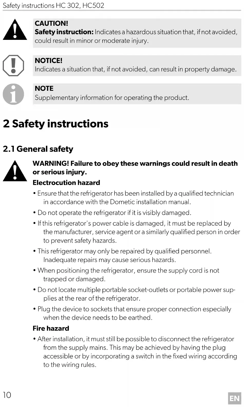 - After installation, it must still be possible to disconnect the refrigerator from the supply mains. This may be achieved by having the plug accessible or by incorporating a switch in the fixed wiring according to the wiring rules. CAUTION! Safety instruction: Indicates a hazardous situation that, if not avoided, could result in minor or moderate injury. NOTICE! Indicates a situation that, if not avoided, can result in property damage. NOTE Supplementary information for operating the product.EN HC 302, HC502 Safety instructions