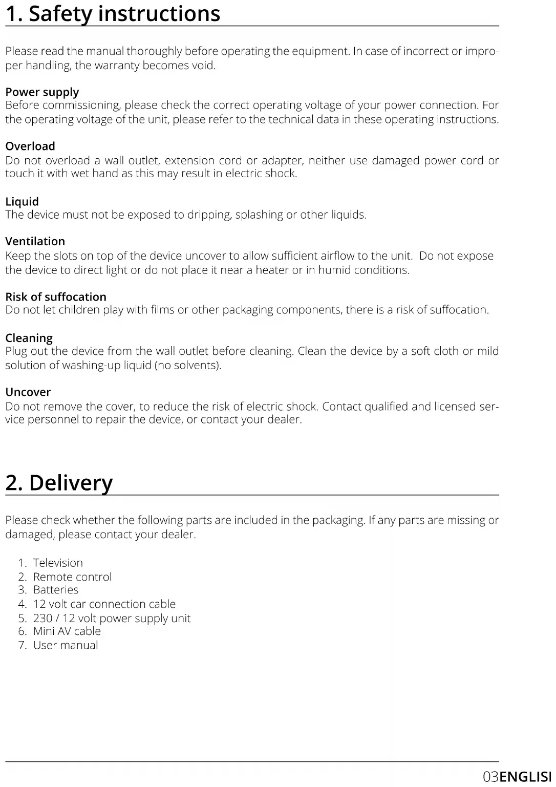Please read the manual thoroughly before operating the equipment. In case of incorrect or impro- per handling, the warranty becomes void. Power supply Before commissioning, please check the correct operating voltage of your power connection. For the operating voltage of the unit, please refer to the technical data in these operating instructions. Overload Do not overload a wall outlet, extension cord or adapter, neither use damaged power cord or touch it with wet hand as this may result in electric shock. Liquid The device must not be exposed to dripping, splashing or other liquids. Ventilation Keep the slots on top of the device uncover to allow sucient airow to the unit. Do not expose the device to direct light or do not place it near a heater or in humid conditions. Risk of suocation Do not let children play with lms or other packaging components, there is a risk of suocation. Cleaning Plug out the device from the wall outlet before cleaning. Clean the device by a soft cloth or mild solution of washing-up liquid (no solvents). Uncover Do not remove the cover, to reduce the risk of electric shock. Contact qualied and licensed ser- vice personnel to repair the device, or contact your dealer.Plug the stand into the TV as shown. Use a suitable screwdriver and fasten the feet with the enclosed screws. Make sure that the screws are properly tightened. Place the TV on a at, soft surface (e.g. blanket, foam, etc.) to prevent damage to the TV or display.