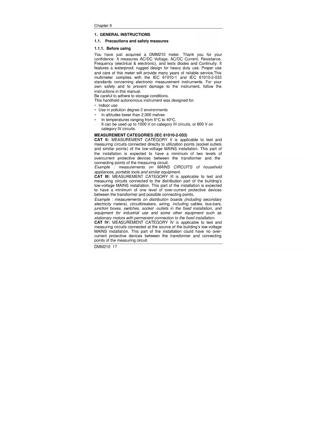 You have just acquired a DMM210 meter. Thank you for your confidence. It measures AC/DC Voltage, AC/DC Current, Resistance, Frequency (electrical & electronic), and tests diodes and Continuity. It features a waterproof, rugged design for heavy duty use. Proper use and care of this meter will provide many years of reliable service.This multimeter complies with the IEC 61010-1 and IEC 61010-2-033 standards concerning electronic measurement instruments. For your own safety and to prevent damage to the instrument, follow the instructions in this manual. Be careful to adhere to storage conditions. This handheld autonomous instrument was designed for: ∗ Indoor use ∗ Use in pollution degree 2 environments ∗ In altitudes lower than 2,000 metres ∗ In temperatures ranging from 5°C to 40°C. ∗ It can be used up to 1000 V on category III circuits, or 600 V on category IV circuits. MEASUREMENT CATEGORIES (IEC 61010-2-033) CAT II: MEASUREMENT CATEGORY II is applicable to test and measuring circuits connected directly to utilization points (socket outlets and similar points) of the low-voltage MAINS installation. This part of the installation is expected to have a minimum of two levels of overcurrent protective devices between the transformer and the connecting points of the measuring circuit. Example : measurements on MAINS CIRCUITS of household appliances, portable tools and similar equipment. CAT III: MEASUREMENT CATEGORY III is applicable to test and measuring circuits connected to the distribution part of the building’s low-voltage MAINS installation. This part of the installation is expected to have a minimum of one level of over-current protective devices between the transformer and possible connecting points. Example : measurements on distribution boards (including secondary electricity meters), circuitbreakers, wiring, including cables, bus-bars, junction boxes, switches, socket -outlets in the fixed installation, and equipment for industrial use and some other equipment such as stationary motors with permanent connection to the fixed installation. CAT IV: MEASUREMENT CATEGORY IV is applicable to test and measuring circuits connected at the source of the building’s low-voltage MAINS installation. This part of the installation could have no over- current protective devices between the transformer and connecting points of the measuring circuit.Chapter II 18 DMM210 Example : measurements on devices installed before the main fuse or circuit breaker in the building installation.