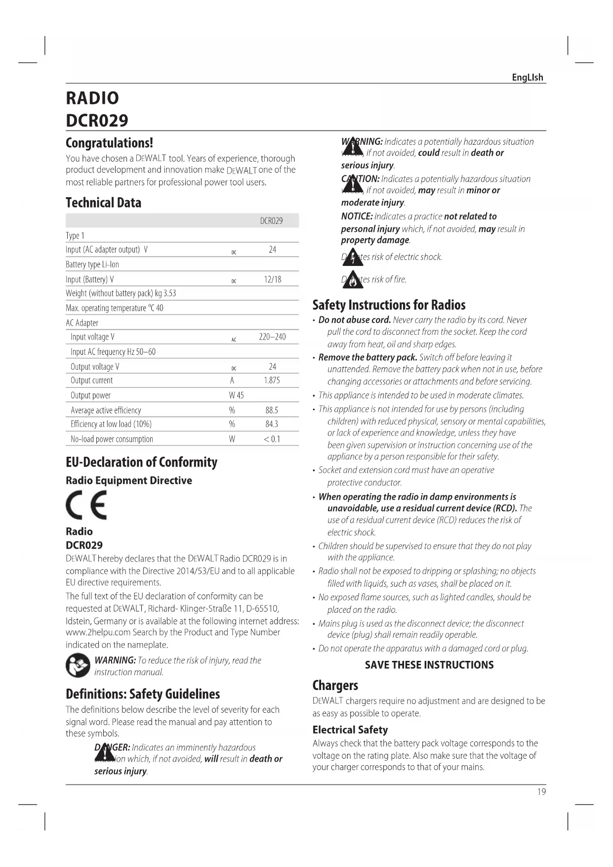 Output current A 1.875 Output power W 45 Average active efficiency % 88.5 Efficiency at low load (10%) % 84.3 No-load power consumption W < 0.1 EU-Declaration of Conformity Radio Equipment Directive Radio DCR029 DeWALT hereby declares that the DeWALT Radio DCR029 is in compliance with the Directive 2014/53/EU and to all applicable EU directiverequirements. The full text of the EU declaration of conformity can be requested at DeWALT , Richard- Klinger-Straße 11, D-65510, Idstein, Germany or is available at the following internet address: www.2helpu.com Search by the Product and Type Number indicated on thenameplate.