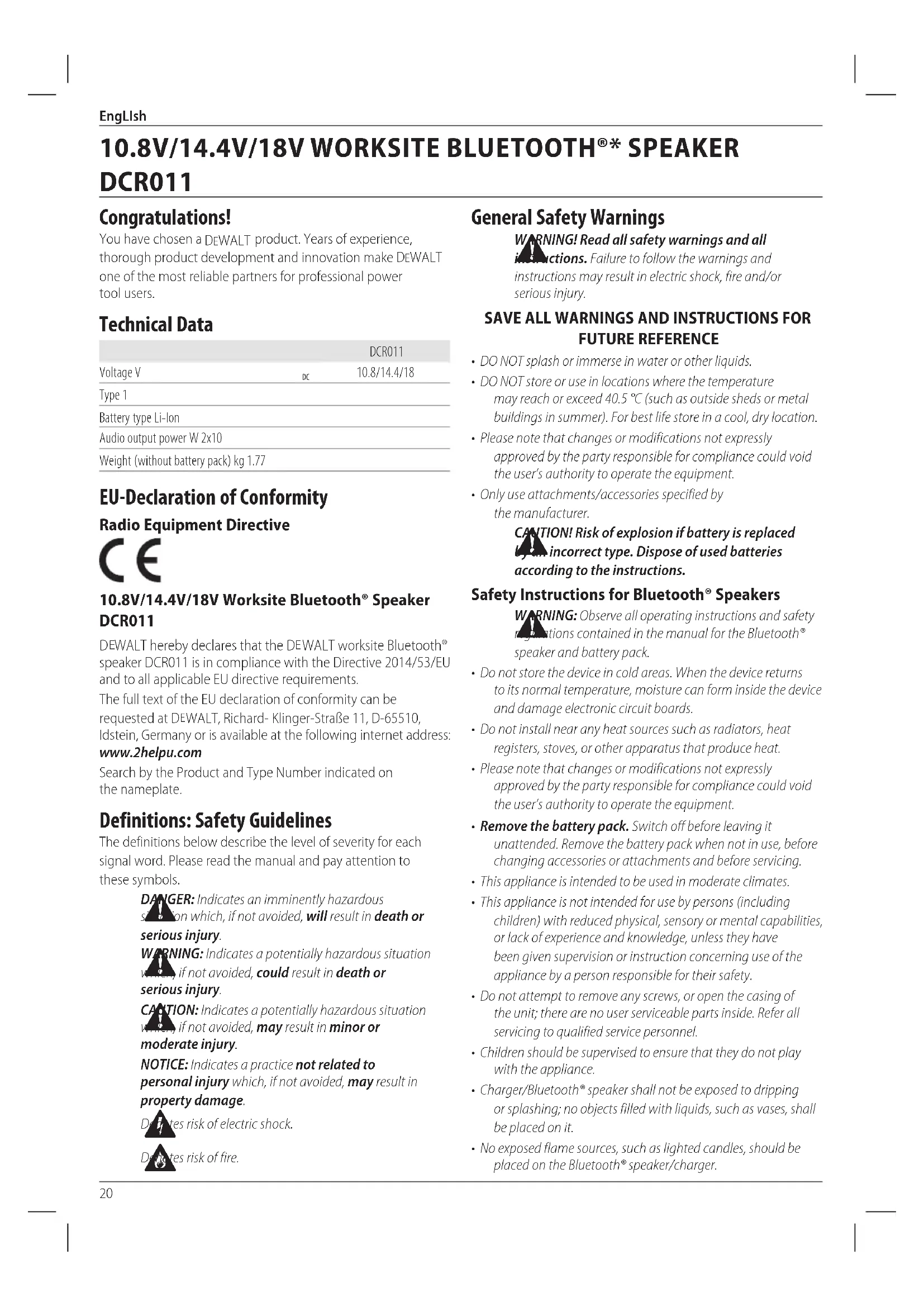 WARNING: Observe all operating instructions and safety regulations contained in the manual for the Bluetooth® speaker and batterypack.• Do not store the device in cold areas. When the device returns to its normal temperature, moisture can form inside the device and damage electronic circuitboards.• Do not install near any heat sources such as radiators, heat registers, stoves, or other apparatus that produceheat.• Please note that changes or modifications not expressly approved by the party responsible for compliance could void the user’s authority to operate theequipment.• Remove the battery pack. Switch off before leaving it unattended. Remove the battery pack when not in use, before changing accessories or attachments and beforeservicing.• This appliance is intended to be used in moderateclimates.• This appliance is not intended for use by persons(including children) with reduced physical, sensory or mental capabilities, or lack of experience and knowledge, unless they have been given supervision or instruction concerning use of the appliance by a person responsible for theirsafety.• Do not attempt to remove any screws, or open the casing of the unit; there are no user serviceable parts inside. Refer all servicing to qualified servicepersonnel.• Children should be supervised to ensure that they do not play with theappliance.• Charger/Bluetooth® speaker shall not be exposed to dripping or splashing; no objects filled with liquids, such as vases, shall be placed onit.• No exposed flame sources, such as lighted candles, should be placed on the Bluetooth® speaker/charger. Congratulations! You have chosen a DeWALT product. Years of experience, thorough product development and innovation make DeWALT one of the most reliable partners for professional power toolusers. Technical Data DCR011Voltage V 10.8/14.4/18Type 1Battery type Li-IonAudio output power W 2x10Weight (without battery pack) kg 1.77 EU-Declaration of Conformity Radio Equipment Directive 10.8V/14.4V/18V Worksite Bluetooth® Speaker DCR011