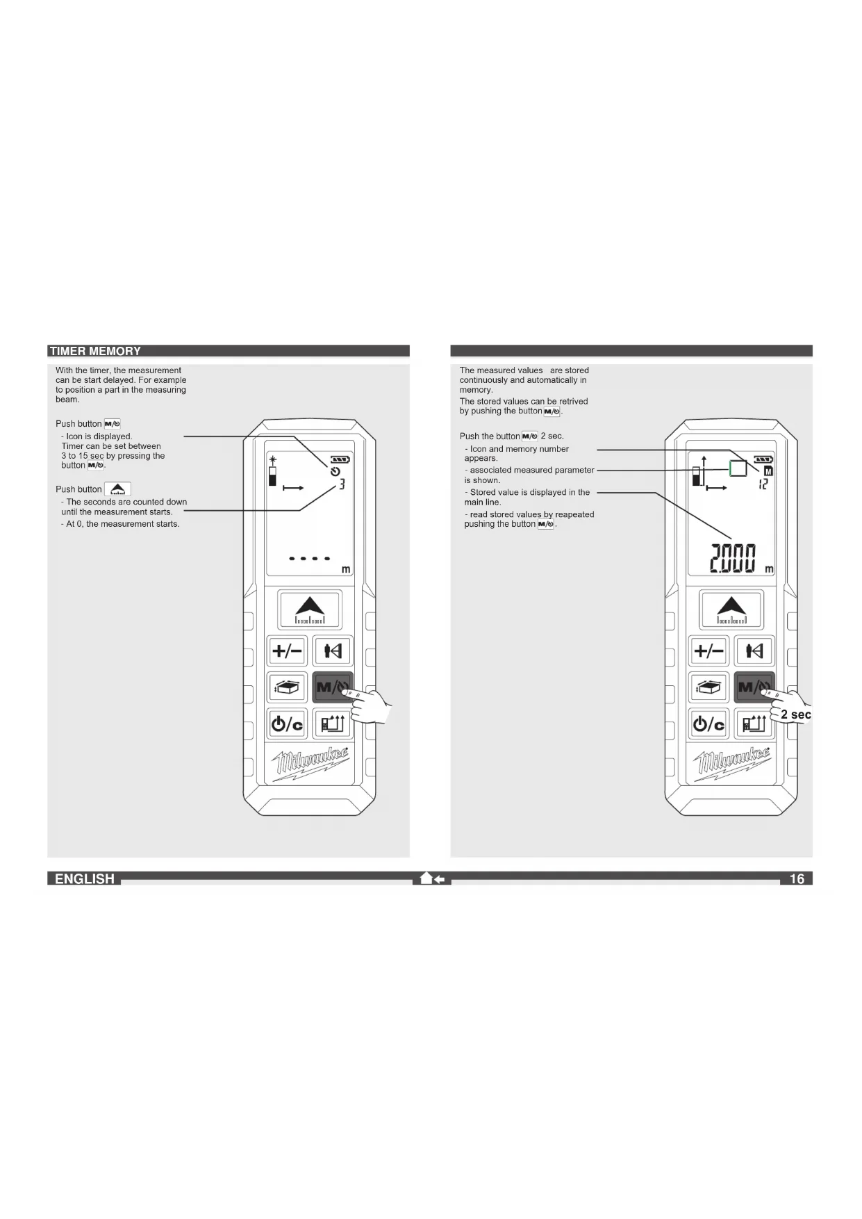 2 sec ENGLISH TIMER MEMORY With the timer, the measurement can be start delayed. For example to position a part in the measuring beam. Push button - Icon is displayed. Timer can be set between 3 to 15 sec by pressing the button