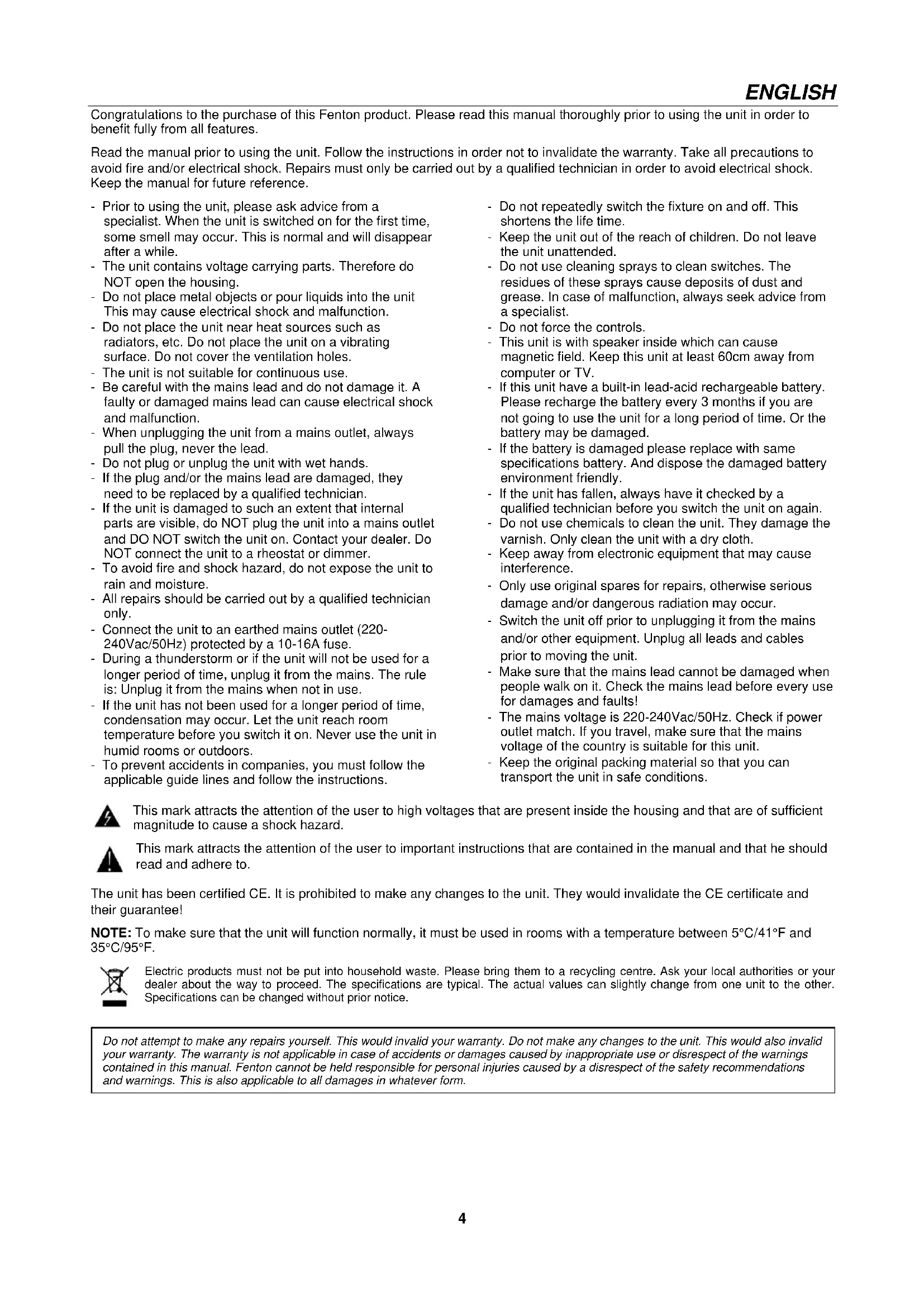 V1.4234 ENGLISH Congratulations to the purchase of this Fenton product. Please read this manual thoroughly prior to using the unit in order to benefit fully from all features. Read the manual prior to using the unit. Follow the instructions in order not to invalidate the warranty. Take all precautions to avoid fire and/or electrical shock. Repairs must only be carried out by a qualified technician in order to avoid electrical shock. Keep the manual for future reference. - Prior to using the unit, please ask advice from a specialist. When the unit is switched on for the first time, some smell may occur. This is normal and will disappear after a while. - The unit contains voltage carrying parts. Therefore do NOT open the housing. - Do not place metal objects or pour liquids into the unit This may cause electrical shock and malfunction. - Do not place the unit near heat sources such as radiators, etc. Do not place the unit on a vibrating surface. Do not cover the ventilation holes. - The unit is not suitable for continuous use. - Be careful with the mains lead and do not damage it. A faulty or damaged mains lead can cause electrical shock and malfunction. - When unplugging the unit from a mains outlet, always pull the plug, never the lead. - Do not plug or unplug the unit with wet hands. - If the plug and/or the mains lead are damaged, they need to be replaced by a qualified technician. - If the unit is damaged to such an extent that internal parts are visible, do NOT plug the unit into a mains outlet and DO NOT switch the unit on. Contact your dealer. Do NOT connect the unit to a rheostat or dimmer. - To avoid fire and shock hazard, do not expose the unit to rain and moisture. - All repairs should be carried out by a qualified technician only. - Connect the unit to an earthed mains outlet (220- 240Vac/50Hz) protected by a 10-16A fuse. - During a thunderstorm or if the unit will not be used for a longer period of time, unplug it from the mains. The rule is: Unplug it from the mains when not in use. - If the unit has not been used for a longer period of time, condensation may occur. Let the unit reach room temperature before you switch it on. Never use the unit in humid rooms or outdoors. - To prevent accidents in companies, you must follow the applicable guide lines and follow the instructions. - Do not repeatedly switch the fixture on and off. This shortens the life time. - Keep the unit out of the reach of children. Do not leave the unit unattended. - Do not use cleaning sprays to clean switches. The residues of these sprays cause deposits of dust and grease. In case of malfunction, always seek advice from a specialist. - Do not force the controls. - This unit is with speaker inside which can cause magnetic field. Keep this unit at least 60cm away from computer or TV. - If this unit have a built-in lead-acid rechargeable battery. Please recharge the battery every 3 months if you are not going to use the unit for a long period of time. Or the battery may be damaged. - If the battery is damaged please replace with same specifications battery. And dispose the damaged battery environment friendly. - If the unit has fallen, always have it checked by a qualified technician before you switch the unit on again. - Do not use chemicals to clean the unit. They damage the varnish. Only clean the unit with a dry cloth. - Keep away from electronic equipment that may cause interference. - Only use original spares for repairs, otherwise serious damage and/or dangerous radiation may occur. - Switch the unit off prior to unplugging it from the mains and/or other equipment. Unplug all leads and cables prior to moving the unit. - Make sure that the mains lead cannot be damaged when people walk on it. Check the mains lead before every use for damages and faults! - The mains voltage is 220-240Vac/50Hz. Check if power outlet match. If you travel, make sure that the mains voltage of the country is suitable for this unit. - Keep the original packing material so that you can transport the unit in safe conditions. This mark attracts the attention of the user to high voltages that are present inside the housing and that are of sufficient magnitude to cause a shock hazard. This mark attracts the attention of the user to important instructions that are contained in the manual and that he should read and adhere to. The unit has been certified CE. It is prohibited to make any changes to the unit. They would invalidate the CE certificate and their guarantee! NOTE: To make sure that the unit will function normally, it must be used in rooms with a temperature between 5°C/41°F and 35°C/95°F. Electric products must not be put into household waste. Please bring them to a recycling centre. Ask your local authorities or your dealer about the way to proceed. The specifications are typical. The actual values can slightly change from one unit to the other. Specifications can be changed without prior notice.