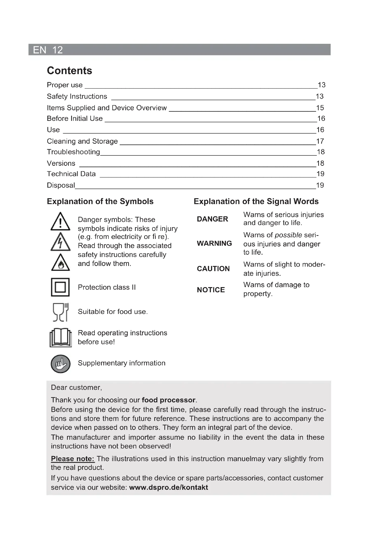 tions and technical data provided with this device. Fail- ure to follow the safety notices and instructions may result in electric shock, fi re and / or injuries. ■ This device may be used by people with reduced physical, sen- sory or mental abilities or a lack of experience and/or knowledge if they are supervised or have received instruction on how to use the device safely and have understood the dangers resulting from this. ■ This device must not be used by children. Children and animals must be kept away from the device and the mains cable! ■ The device is not a toy! ■ The device is not designed to be operated with an external timer or a separate remote control system. ■ Never immerse the device, mains cable or mains plug in water or other liquids and ensure that they cannot fall into water or become wet. ■ The device must always be disconnected from the mains power when it is left unattended, when it is being assembled or disas- sembled, and before cleaning. ■ Do not make any modifi cations to the device. You may not re- place the mains cable yourself. If the device, the mains cable or the mains plug of the device is damaged, it must be replaced by the manufacturer, customer service department or a similarly qualifi ed person (e.g. specialist workshop) in order to avoid any hazards. ■ It is essential to follow the instructions in the “Cleaning and Care” chapter.EN 14 DANGER – Danger of Electric Shock ■ Never immerse the motor unit, mains cable or mains plug in water or other liquids and ensure that they cannot fall into water or become wet. ■ Should the device fall into water, switch off the power supply immediately. Do not at- tempt to pull the device out of the water while it is still connected to the mains power! ■ Never touch the device, mains cable or mains plug with wet hands when these com- ponents are connected to the mains power. WARNING – Danger of Injury ■ Warning of suffocation! Keep children and animals away from the packaging ma- terial. ■ Danger of strangulation! Make sure that the mains cable is always kept out of the reach of small children and animals. ■ Danger of injuries caused by rotating parts of the device! Keep clothing, jewel- lery, hair, hands and other body parts away from the device so that nothing can get caught in rotating device parts. ■ Danger of scalding! Do not use any hot food in the device as it could spurt out during use. ■ Danger of tripping! Make sure that the connected mains cable does not present a trip hazard. The mains cable must not hang down from the surface on which the device is placed in order to prevent the device from being pulled down. ■ Do not move the device during operation. Ensure suffi cient stability. WARNING – Danger of Fire ■ Do not use the device in rooms containing easily ignitable dust or poisonous and explosive fumes. ■ Do not operate the device in the vicinity of combustible material. Do not place any combustible materials (e.g. cardboard, paper or plastic) on or in the device. ■ Do not cover the device during operation. ■ Do not place any objects into the ventilation slots of the device and make sure that no objects block the ventilation slots. ■ In the event of a fi re: Do not extinguish with water! Smother the fl ames with a fi re- proof blanket or a suitable fi re extinguisher. NOTICE – Risk of Damage to Material and Property ■ Only connect the device to a properly installed plug socket. The socket must also be readily accessible after connection so that the connection to the mains can quickly be isolated. The mains voltage must match the rating plate of the device. Only use suitable extension cables whose technical data is the same as that of the device. ■ Always place the device on a dry, level and solid surface with adequate space on all sides. ■ The device should only be used if it has been correctly assembled!15 EN ■ Make sure that the mains cable is not squashed, bent or laid over sharp edges and does not come into contact with hot surfaces. ■ The mains cable must not hang down from the surface on which the device is placed in order to prevent the device from being pulled down. ■ Switch off the device and pull the mains plug out of the plug socket if an error occurs during operation or before a thunderstorm. ■ When the mains plug is removed from the plug socket, always pull on the mains plug and never the mains cable. ■ Do not pull or carry the device by the mains cable. ■ Do not operate the device without food. This might result in the device overheating or damage to the motor. ■ Use only original spare parts from the manufacturer. If accessory parts which are not authorised by the manufacturer are used, all warranty and guarantee claims are void. ■ Never place heavy objects on the device. ■ Protect the device from other heat sources, naked fl ames, sub-zero temperatures, persistent moisture, wet conditions, direct sunlight and impacts. Items Supplied and Device Overview