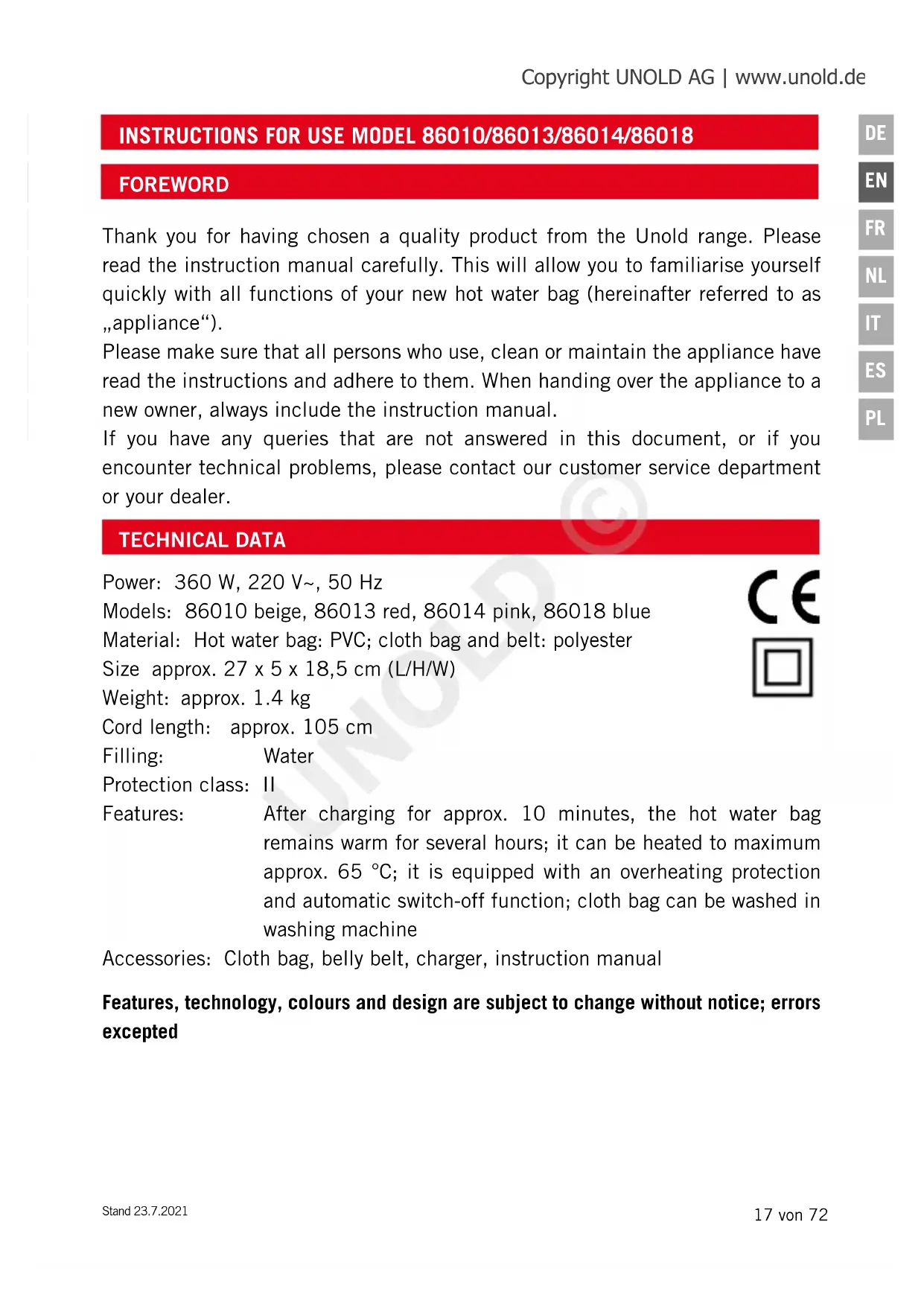 After charging for approx. 10 minutes, the hot water bag remains warm for several hours; it can be heated to maximum approx. 65 °C; it is equipped with an overheating protection and automatic switch-off function; cloth bag can be washed in washing machine Accessories: Cloth bag, belly belt, charger, instruction manual Features, technology, colours and design are subject to change without notice; errors excepted Copyright UNOLD AG | www.unold.de UNOLD ©18 von 72 Stand 23.7.2021