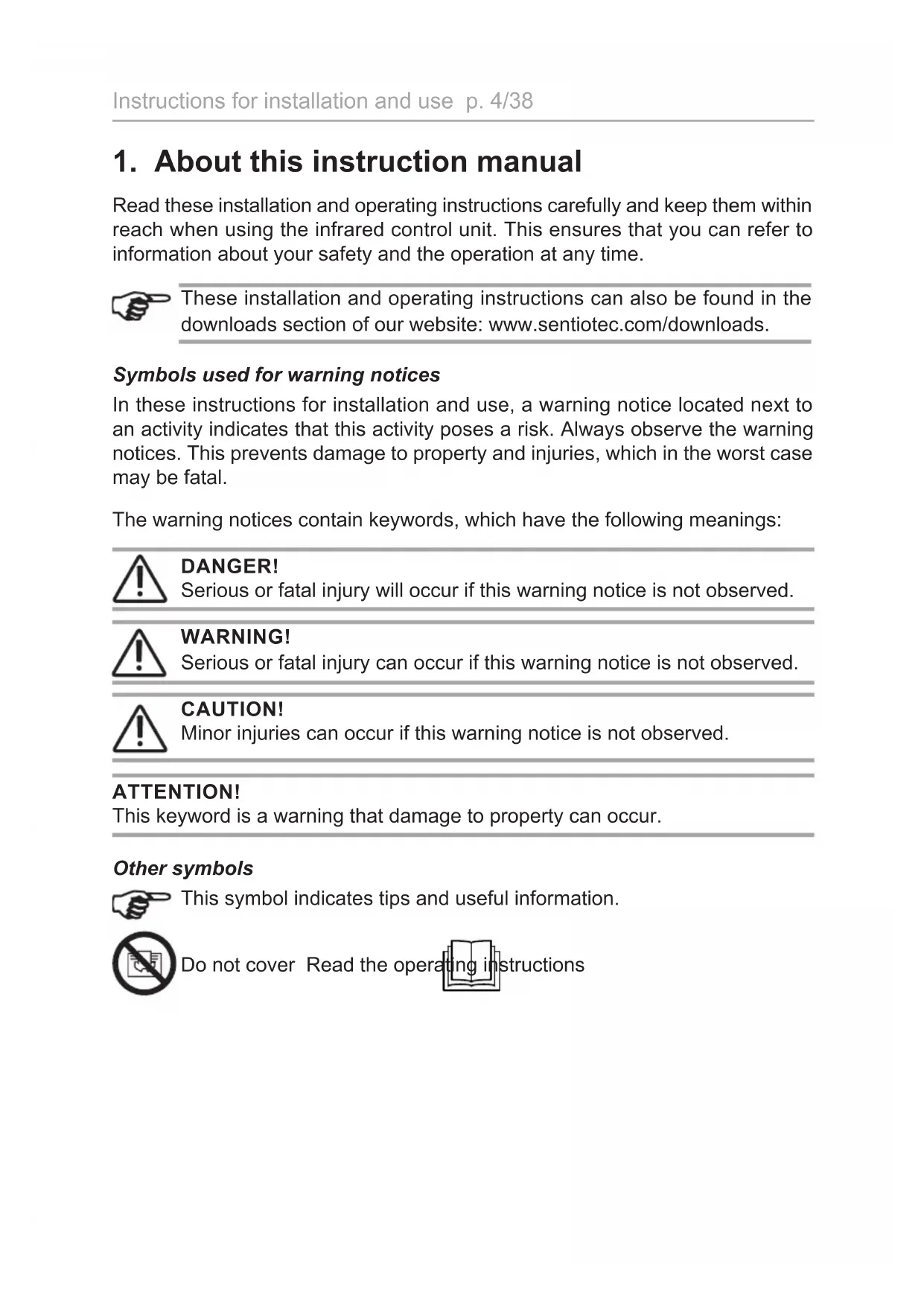 Read these installation and operating instructions carefully and keep them within reach when using the infrared control unit. This ensures that you can refer to information about your safety and the operation at any time. Symbols used for warning notices In these instructions for installation and use, a warning notice located next to an activity indicates that this activity poses a risk. Always observe the warning notices. This prevents damage to property and injuries, which in the worst case may be fatal. The warning notices contain keywords, which have the following meanings: DANGER! Serious or fatal injury will occur if this warning notice is not observed. WARNING! Serious or fatal injury can occur if this warning notice is not observed. CAUTION! Minor injuries can occur if this warning notice is not observed. ATTENTION! This keyword is a warning that damage to property can occur. Other symbols This symbol indicates tips and useful information. Do not cover Read the operating instructions These installation and operating instructions can also be found in the downloads section of our website: www.sentiotec.com/downloads.EN Instructions for installation and use p. 5/38
