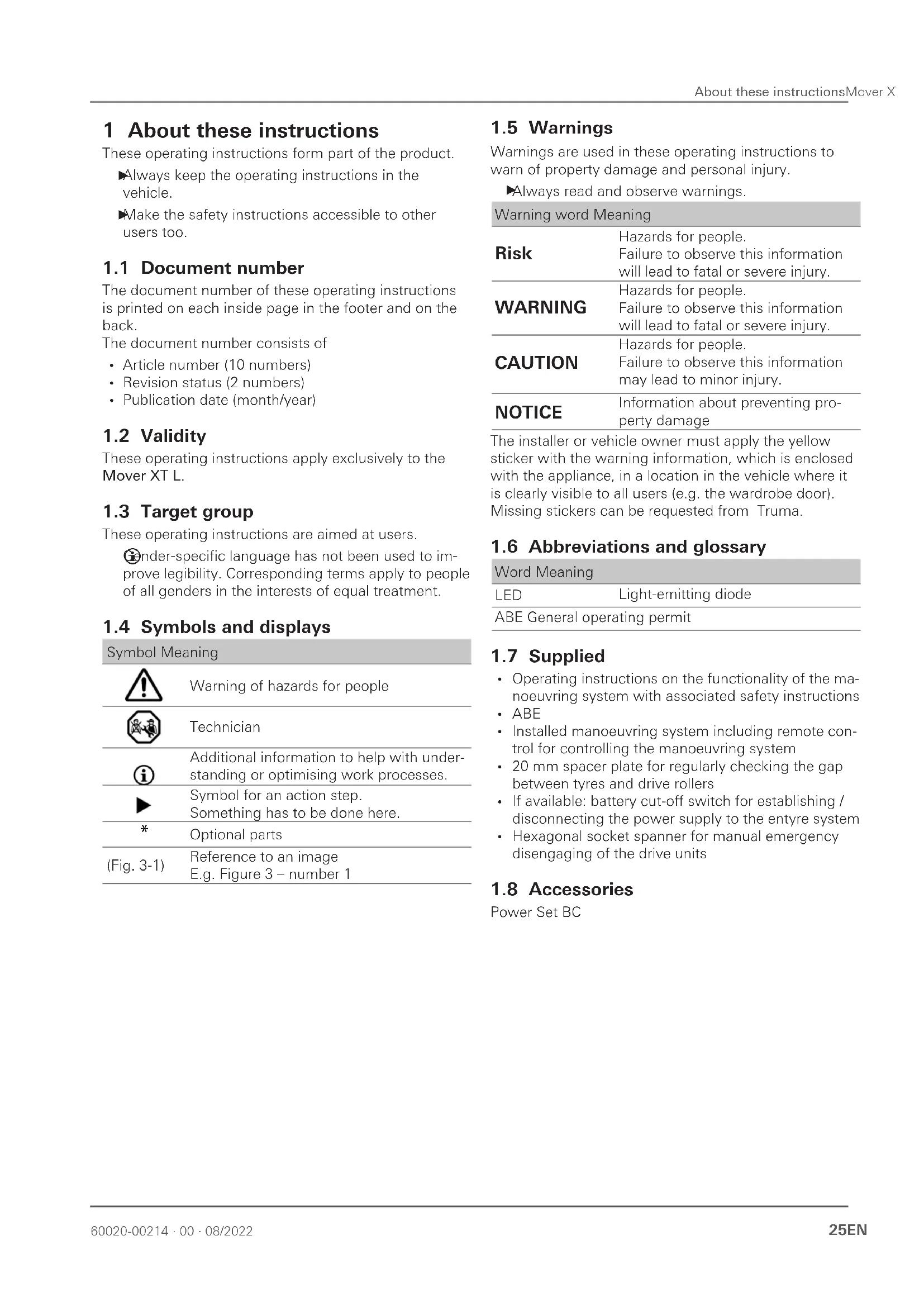 Table of contents 1 About these instructions 25 11 Document number 25 12 Validity 25 13 Target group 25 14 Symbols and displays 25 15 Warnings 25 16 Abbreviations and glossary 25 17 Supplied 25 18 Accessories 25 2 Safety instructions 26 21 General safety 26 22 Obligations of the operator / vehicle owner 26 23 Safe operation 26 24 What to do if malfunctions occur 27 3 Intended use 27 31 Proper use 27 32 Use that is not compliant with the intended pur- pose 27 33 Installation, removal, conversion 27 4 Product description 28 41 Setup 28 42 Product label 29 43 Function 29 44 Power supply 29 45 Remote control 29 5 Operation 33 51 Uncoupling the towing vehicle 33 52 Switch on the manoeuvring system 33 53 Engage the manoeuvring system 34 54 Manoeuvring the caravan 35 55 Coupling to the towing vehicle 37 56 Disengage the manoeuvring system 37 57 Disengage the manoeuvring system manually (emergency disengagement) 38 58 Switch off the manoeuvring system 39 6 Malfunctions 40 61 Troubleshooting guide 40 62 Pairing the electronic control unit with the radio remote control 40 7 Care and maintenance 41 71 12V battery care 41 72 Remote control care 41 73 Tyre care 42 74 Drive unit care 42 75 Maintaining the manoeuvring system 42 76 Maintaining the tyres 42 77 Maintaining the control unit 42 78 Check the gap between the rollers and the tyres 42 79 Standstill for an extended period of time 42 8 Repair 43 9 Disposal and recycling 43 91 Disposing of the manoeuvring system 43 92 Disposing of remote control and batteries 43 10 Technical data 44 11 Warranty 44 111 Scope of Manufacturer's Warranty 44 112 Exclusion of warranty 45 113 Making a warranty claim 4560020-00214 ∙ 00 ∙ 08/2022 About these instructionsMover XT L 25EN 1 About these instructions These operating instructions form part of the product Always keep the operating instructions in the vehicle Make the safety instructions accessible to other users too